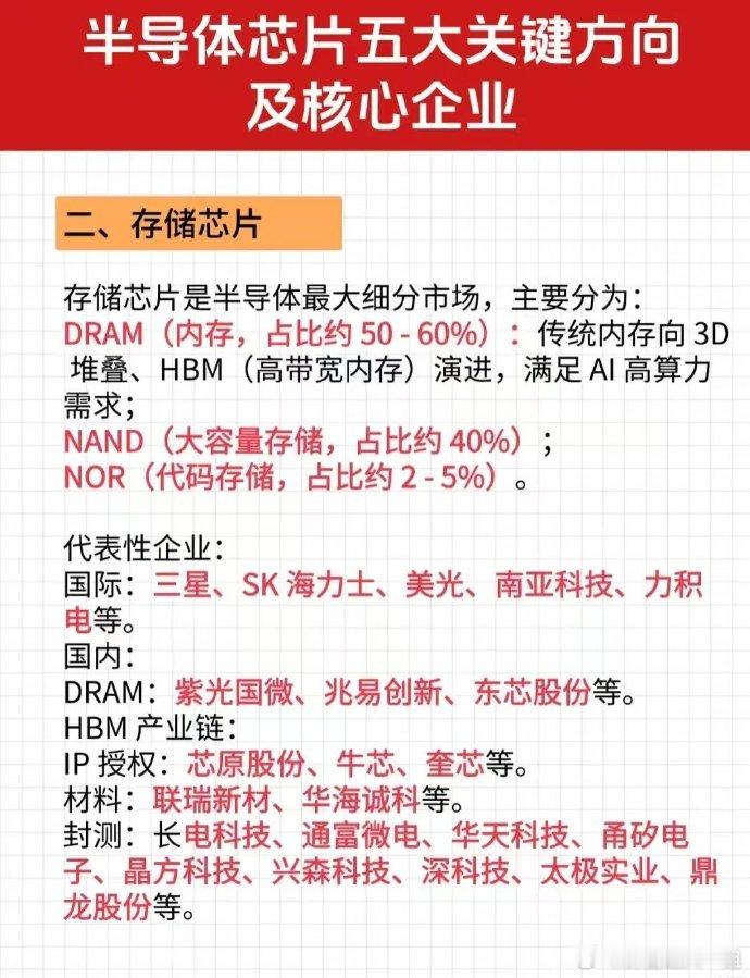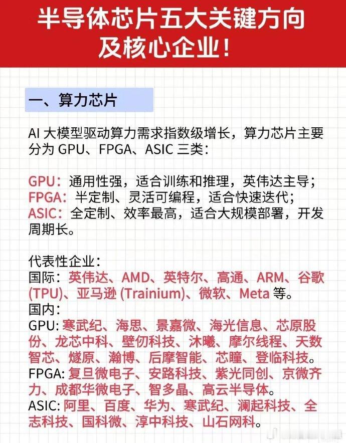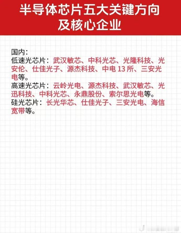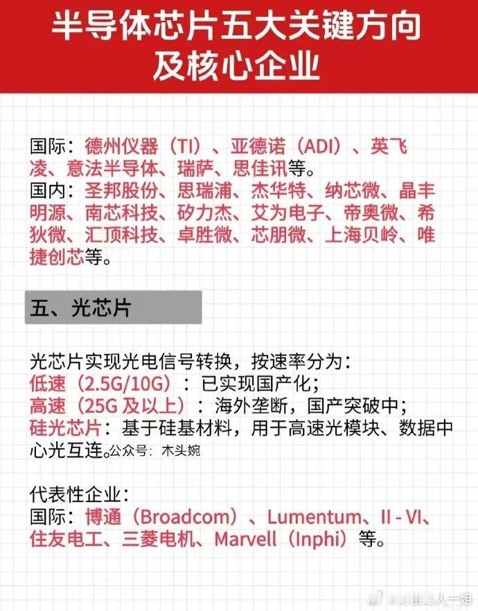 半导体芯片重点关注的五大关键方向:算力芯片概念、存储芯片概念、模拟芯片概念、光芯片概念、系统级芯片概念。各细分领域国内外领先龙头企业有哪些?