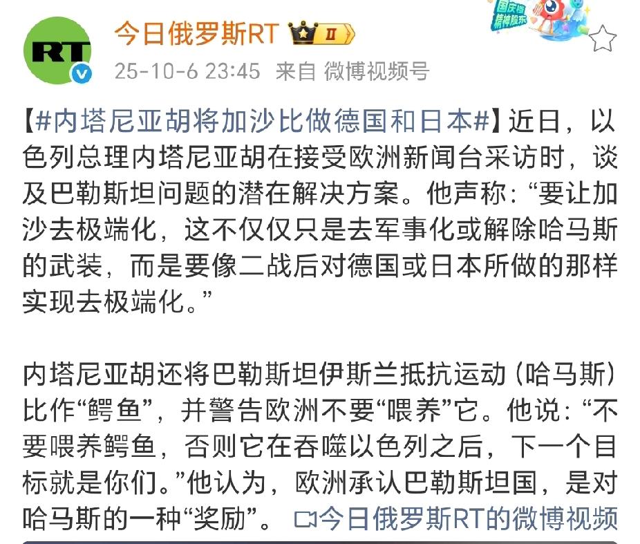 精日的天塌了,内塔尼亚胡将加沙比喻成二战时的日本和德国,认为对付加沙要向对付当年的德国和日本一样,去除极端化。 换句话说,内塔尼亚胡认为二战时的德国和日本是有问题的,是极端仇视文明的,就像现在的加沙一样。 那么我想说的是:那些支持以色列的人怎么看内塔尼亚胡的这番表态? 如果你认为内塔尼亚胡说的对,那就直接承认了二战期间的德国和日本就是纳粹。 但问题是,日本直到现在都不承认二战罪行,也就是说,现在的日本依然没有和当年的军国主义划清界限,依然是纳粹。 太有意思了,精日如此热爱日本,不过是跪舔一个纳粹国家而已,连内塔尼亚胡都认为日本不是一个文明国家,你还在狡辩什么?