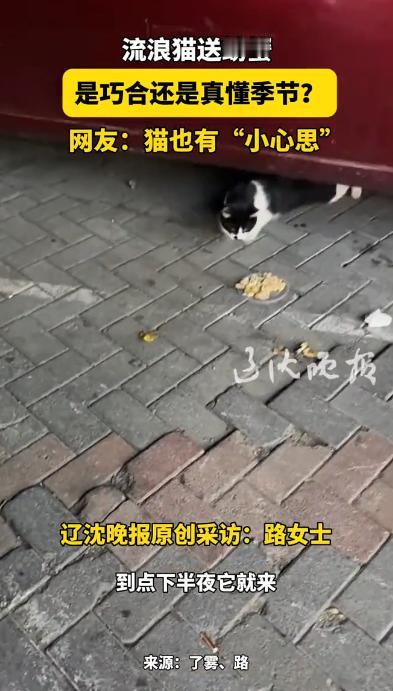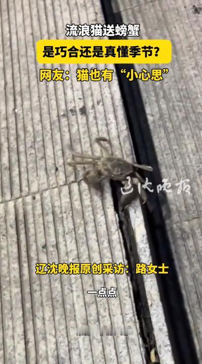 万物皆有灵性!9月25日,辽宁,饭店老板娘最近一直在投喂一只流浪猫,这不深夜突然送来“谢礼”!老远就看到小猫咪赶着一只小螃蟹往饭店来,它可能是不敢叼走,就是一点点的赶着螃蟹走。不得不说这猫咪真懂人情世故,不白喂。网友:猫也有“小心思”! 沈阳市的路女士平时心善,看见饭店门口有只黑白色流浪猫经常饿肚子,就开始定期投喂,这一喂就是20多天,黑色花猫也渐渐熟悉了她,每天傍晚都会准时出现在投喂点等饭。 9月25日晚上,路女士照例在饭店忙完了准备喂猫,却发现黑色花猫正在赶一个东西,走近一看差点笑出声,竟然是只巴掌大的螃蟹,更离谱的是,螃蟹还活着,两只大钳子张牙舞爪的,看起来战斗力十足。 黑色花猫似乎也知道这玩意不好对付,小心翼翼地爪子一点点把螃蟹赶到台阶上,然后用爪子轻轻推到路女士脚边,那架势就像在说:喏给您的,新鲜着呢。 路女士看到后很是感动,因为附近没有卖螃蟹的,花猫也不知道从多远的地方将螃蟹赶过来的,而且还是活的,真的太不容易了,路女士当即决定要收留这只花猫。 路女士将此事分享到了网络上来感谢花猫的报恩,视频传到网上后,引起网友们的热议,有网友评论道:这是知恩图报的最高境界,还有网友调侃:别人家的猫送螃蟹,我家的只会送拖鞋,更有网友脑补起了剧情:猫咪肯定是觉得铲屎官太瘦了,特意送只螃蟹来补补身子。 其实这种行为在动物学上属于正常,猫科动物有分享猎物的天性,野外的母猫会把捕获的猎物带回巢穴喂养幼崽,家猫虽然被驯化了,但这种本能依然存在,当流浪猫把人类当成自己的家人后,就会表现出类似的分享行为。 流浪猫的这种送礼行为,实际上是它们表达信任和依赖的方式,在猫的社会结构中,分享食物是维系群体关系的重要手段,当流浪猫把投喂者纳入自己的社交圈后,就会通过送礼来强化这种关系。 不过专家也提醒,虽然这种行为很暖心,但投喂流浪猫还是要讲究方法,首先要选择合适的地点,避免影响其他居民生活,食物要适量剩饭剩菜可以,但不要喂生肉或者过期食品,最重要的是如果决定长期投喂,最好能联系当地的动物保护组织,给猫咪做绝育手术,避免流浪猫数量失控。 沈阳市动物保护协会的工作人员表示,近年来市民投喂流浪动物的意识在提高,但科学投喂的知识还需要普及,他们建议如果条件允许,可以像北塔公园那样建立流浪猫庇护所,既能保护动物又能规范管理。 至于螃蟹是从哪来的,大家的猜测五花八门,有人说可能是从附近的水产市场顺的,也有人猜是从排水沟里抓的,也有网友分析,9月正是螃蟹上市的季节,菜市场附近经常有螃蟹逃跑,猫咪捡到的可能性很大。 这些温暖的小故事告诉我们,动物虽然不会说话,但它们有自己表达感情的方式,您对流浪猫的每一份善意,它们都记在心里,下次如果您也收到流浪猫的礼物,别嫌弃那可能是它能给您的最好的东西了。 麻烦看官老爷们右上角点击一下“关注”,既方便您进行讨论和分享,又能给您带来不一样的参与感,感谢您的支持!