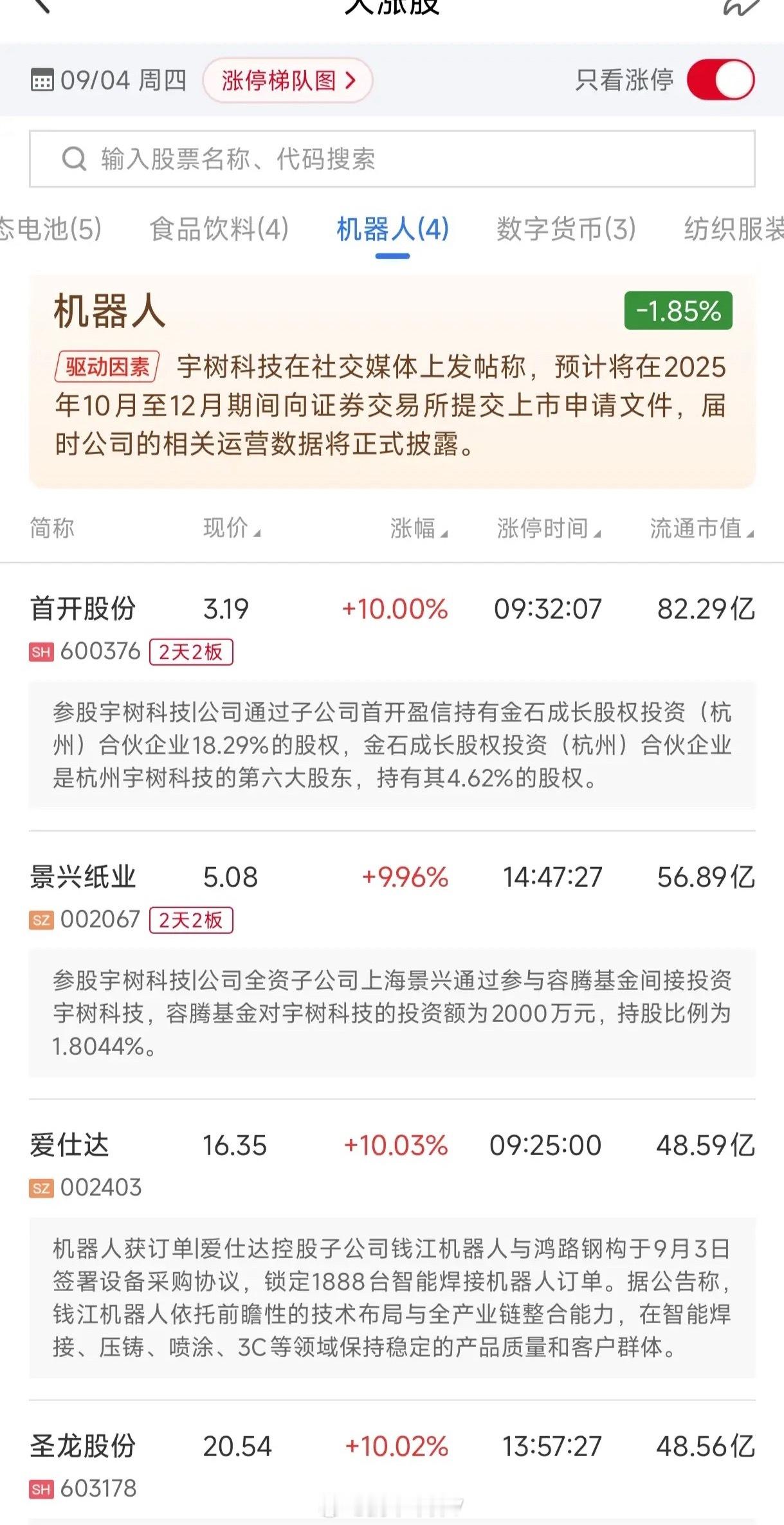 9月4日,机器人板块涨停股是4只,涨停股票数量下降,说明板块内部出现了分歧。板块最高板还是2板但已经出现两只,板块梯队是2-2-1-1的结构。