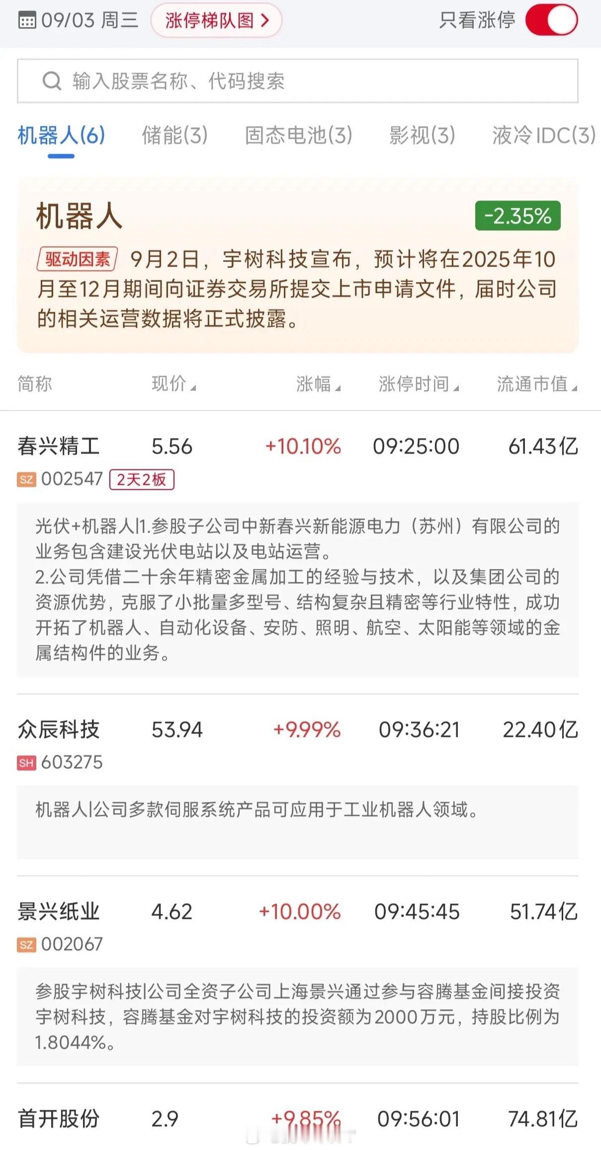 比如2025年9月3日,机器人板块涨停股票是6只,板块最高板是2板且只有一只,板块梯队是2-1-1-1-1-1的结构。(以财联社大涨股为例)