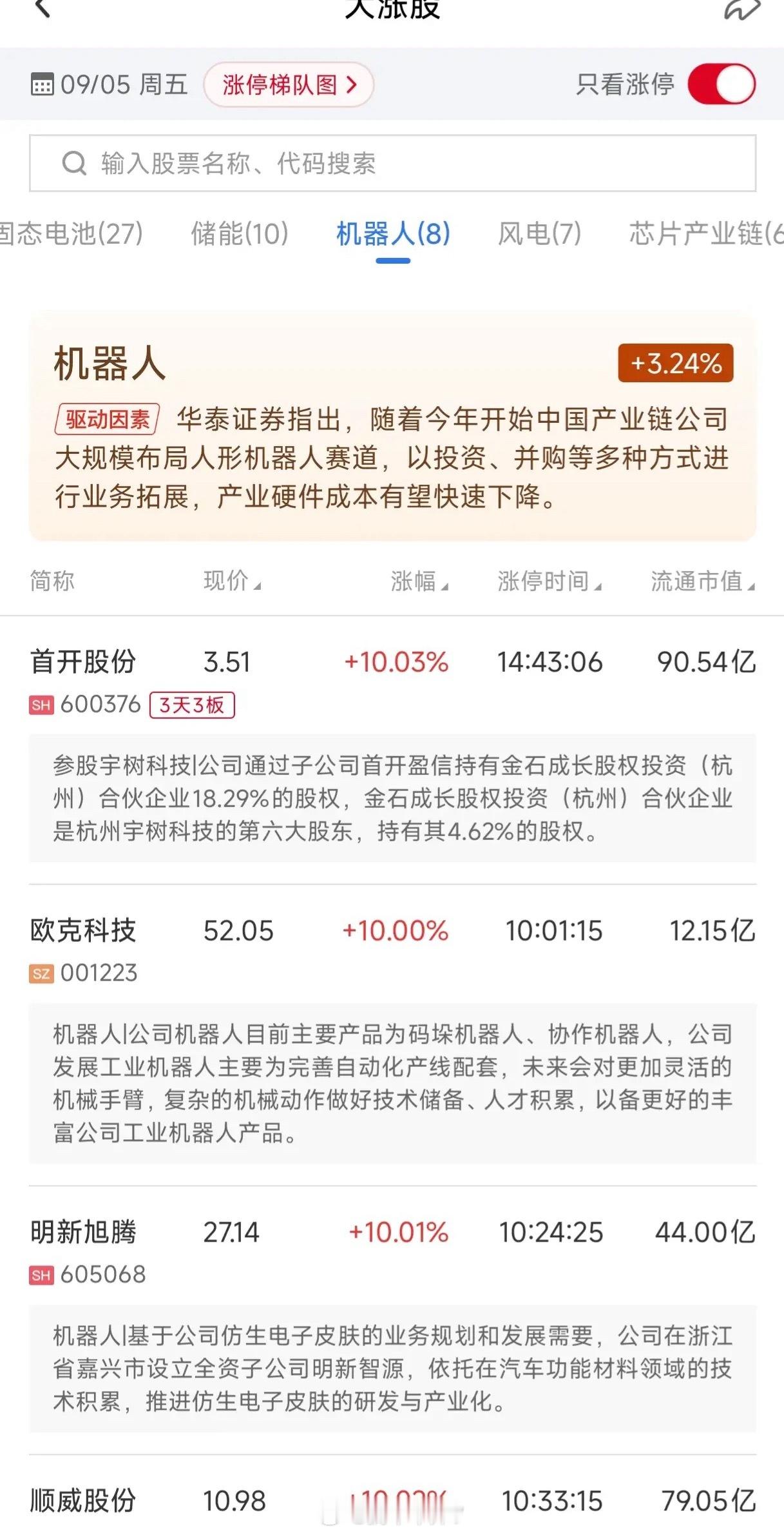 9月5日,机器人板块涨停股票是8只,涨停股票数量明显上升,说明板块整体在发酵,但板块内部个股出现了分歧,当天板块最高板已经进阶到3板即首开股份,3板只有1只,板块梯队是3-1-1-1-1-1-1-1的结构