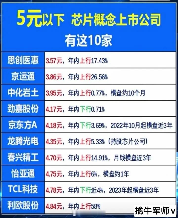 这是一组股价在5元以下、且与芯片概念相关的A股上市公司,其特点为股价低、部分年内涨幅明显,部分长期横盘。具体如下: