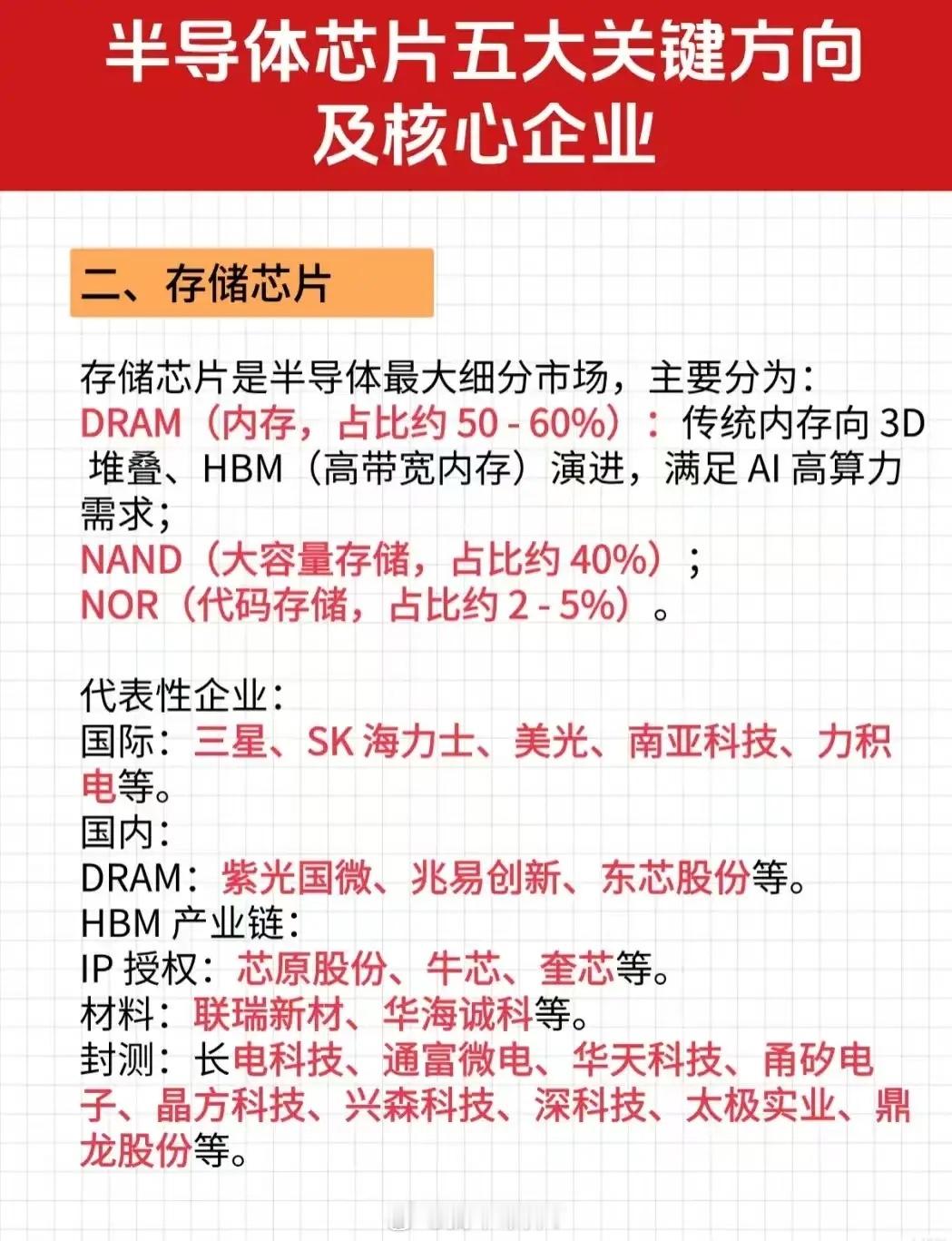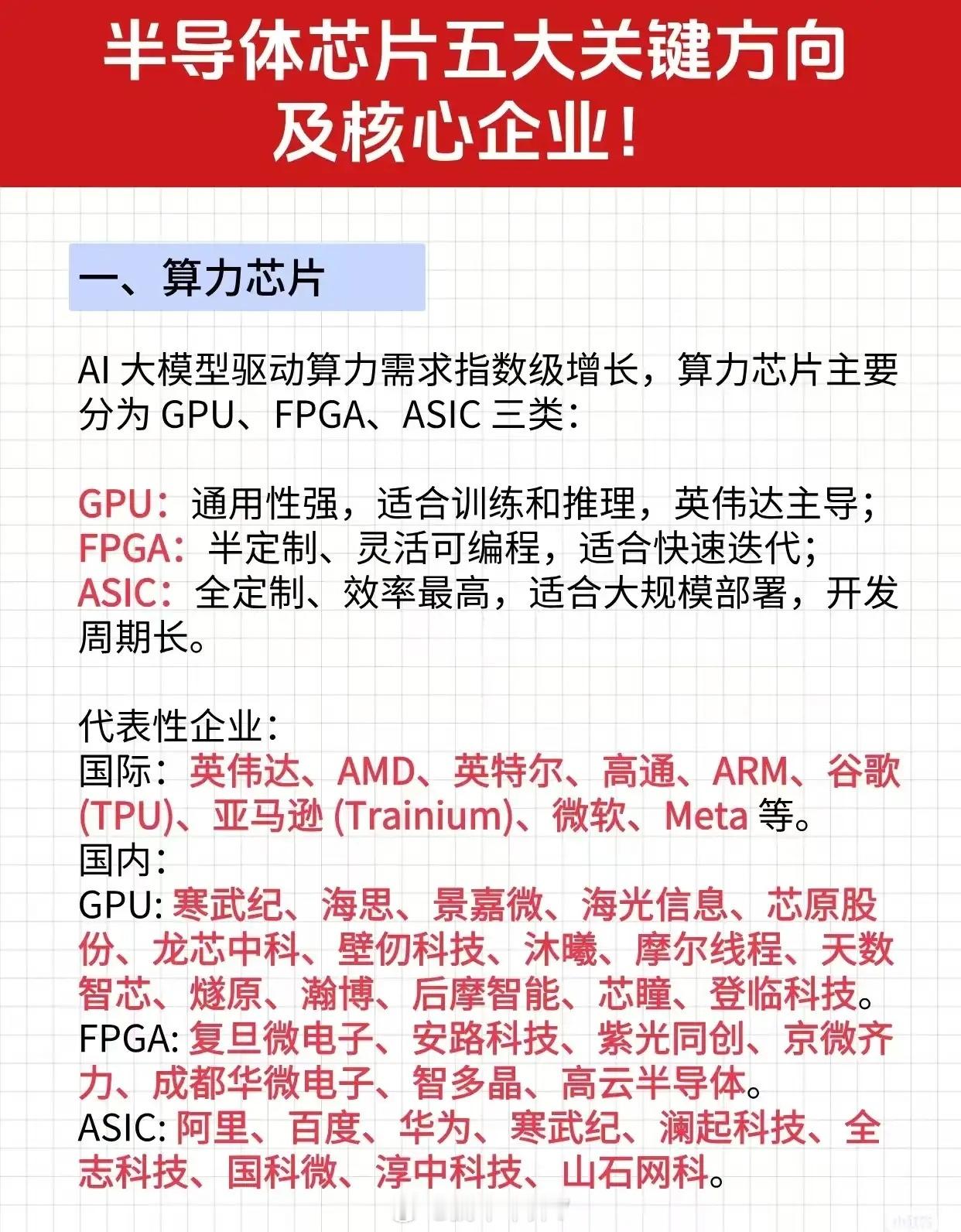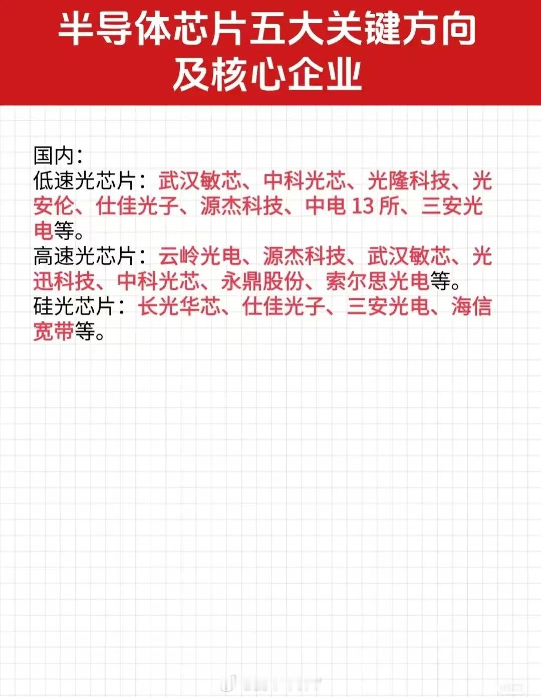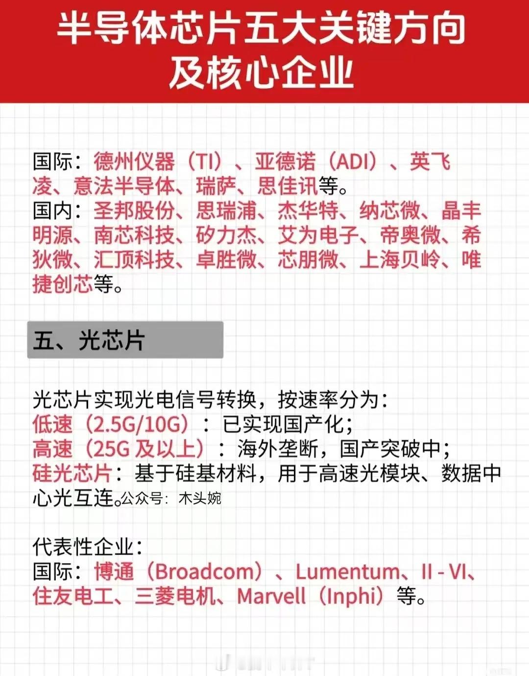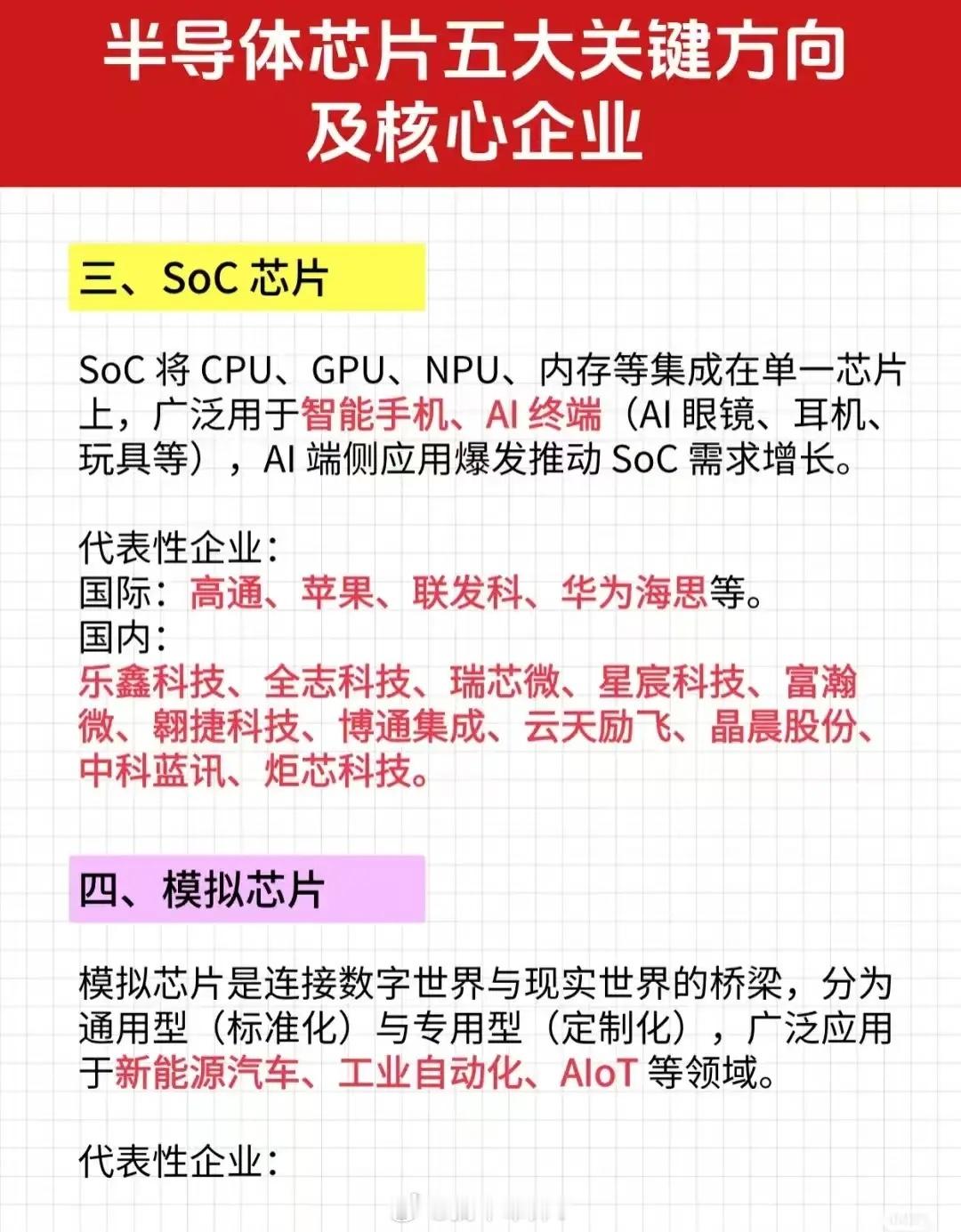半导体芯片重点关注的五大关键方向:算力芯片概念、存储芯片概念、模拟芯片概念、光芯片概念、系统级芯片概念。各细分领域国内外领先龙头企业有哪些?