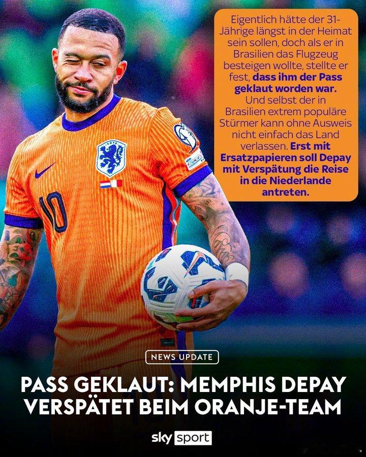 【队史最佳射手没赶上航班】荷兰国家队主教练科曼确认,科林蒂安前锋孟菲斯-德佩因为护照被偷,没赶上航班,目前正在抓紧时间补办护照。