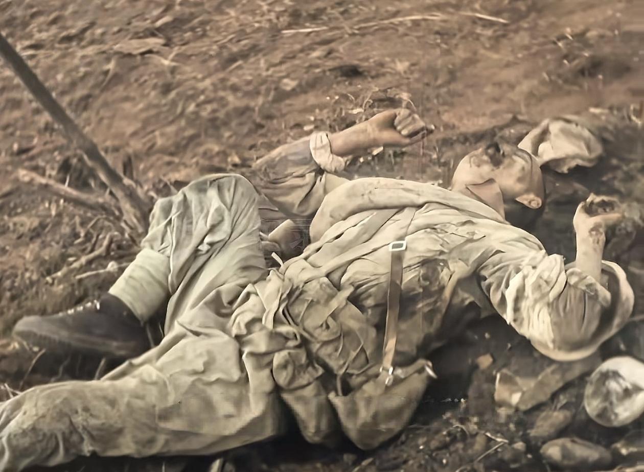 图片是整整74年前美军拍摄的,是守卫天德山的中国人民志愿军第47军141师422团5连牺牲在战场上的英雄们,从1951年10月1日到10月5日,5连在经过多次补充人员后,达到了280人。 他们面对的敌人,是装备精良的美骑 1 师、美 3 师以及希腊营等部队。战斗打响后,美军先用飞机大炮对天德山阵地展开地毯式反复轰炸,炮火覆盖过后,又发动十几次整营整连规模的冲锋,期间还穿插数十次小规模进攻。 每一次轰炸都让阵地面貌改变,泥土与碎石飞溅,工事在炮火中受损。5 连战士们在轰炸间隙抢修工事,用简陋的工具加固掩体,待敌人冲锋时,再从掩体中跃出,依托地形展开反击。 他们用步枪、手榴弹,甚至在弹药不足时用石块、刺刀与敌人对抗,一次次将冲上来的敌人打退。战斗持续到 10 月 5 日,5 个昼夜的坚守中,阵地数次面临被突破的风险,战士们始终没有退缩,有人在抢修工事时被炮弹击中,有人在与敌人近身搏斗时负伤,却依然坚持战斗。 这场坚守,5 连付出巨大牺牲,也取得显著战果。经统计,他们共歼敌 870 多人。到最后主动撤离天德山主阵地时,全连仅剩下 17 人,其中最初加入 5 连的官兵,只有杨宝山等 4 人留存。战斗结束后,许多烈士的遗体来不及掩埋,这成为幸存战士心中难以磨灭的遗憾,这份心痛伴随他们此后的人生。 杨宝山作为幸存的老 5 连官兵之一,后来在回忆中提到,战斗最激烈时,阵地上的电话线多次被炮火打断,通信兵冒着炮火往返抢修,有人在途中倒下,后面的人就接着冲上去。 有战士在弹药耗尽后,抱着爆破筒冲向敌人坦克,用自己的牺牲阻挡敌军推进。还有的战士在身负重伤后,仍趴在阵地上向敌人射击,直到最后一刻。这些细节,拼凑出 5 连战士们在天德山阵地上的战斗日常。 第 47 军 141 师在后续战报中记录,天德山战役的坚守,为志愿军整体防线的稳定争取了时间。5 连的顽强抵抗,迟滞了敌军的进攻节奏,为后续部队调整部署创造条件。 这场战斗也成为志愿军防御作战中的典型案例,展现出即便在装备差距明显的情况下,凭借坚定意志与战术配合,依然能有效打击敌人。 74 年过去,那张美军拍摄的照片被妥善保存,照片中的英雄们虽已远去,但他们的事迹通过史料、幸存者回忆以及纪念馆陈列,不断被后人知晓。 天德山如今已恢复平静,但山上留存的战壕、弹坑遗迹,仍默默诉说着当年的战斗。每年都有民众来到这里,缅怀那些为守护和平牺牲的志愿军战士,传承他们的精神。 这场发生在 74 年前的坚守,不仅是一场战役的记录,更成为民族精神的一部分。5 连战士们用行动诠释着责任与担当,他们的故事跨越时空,至今仍能让人感受到那份炽热的家国情怀,提醒着后人铭记历史,珍惜当下的和平生活。