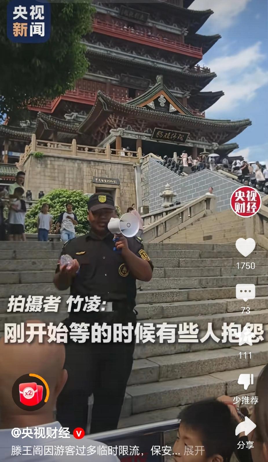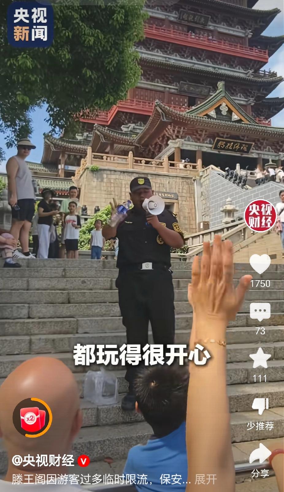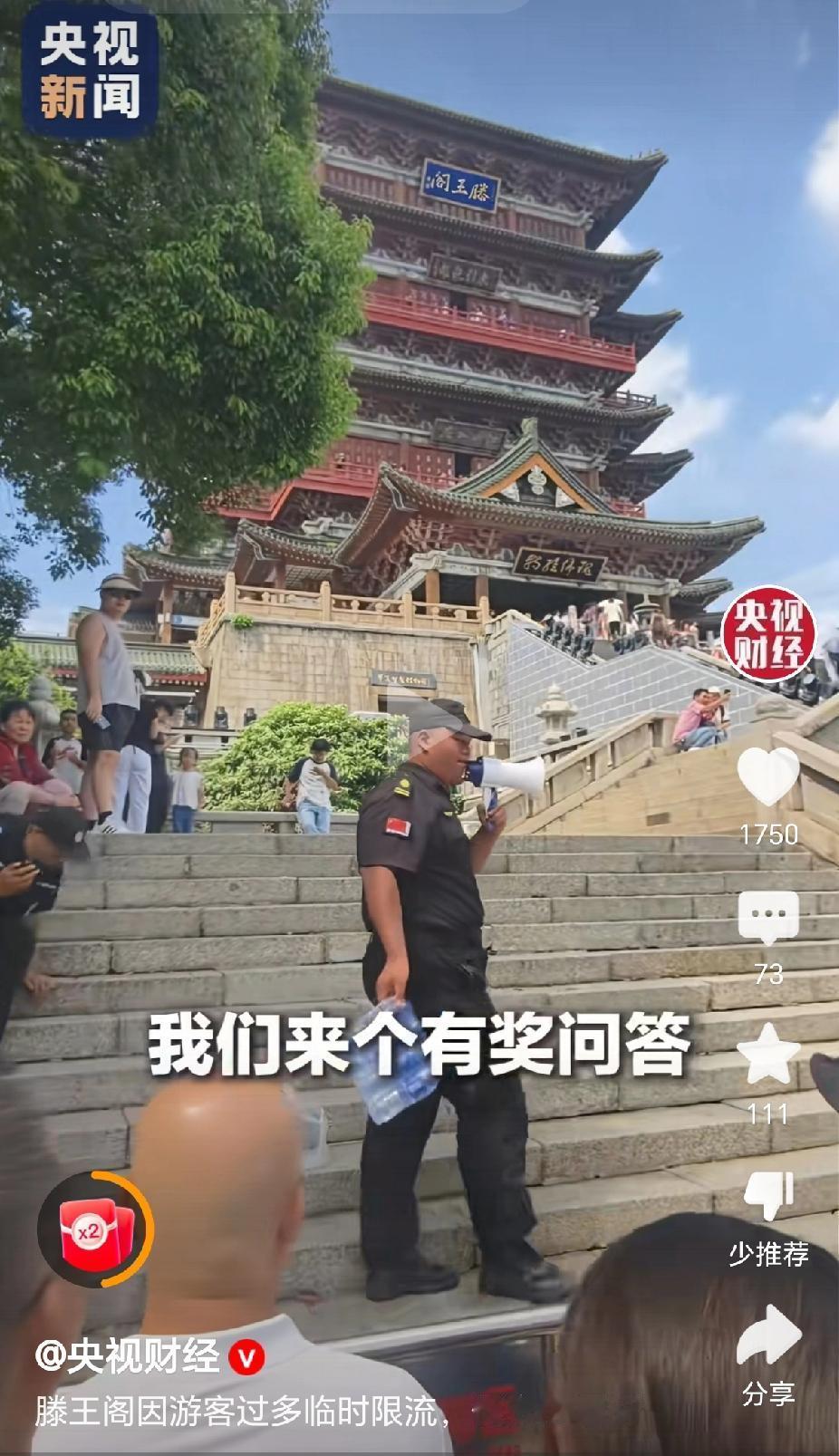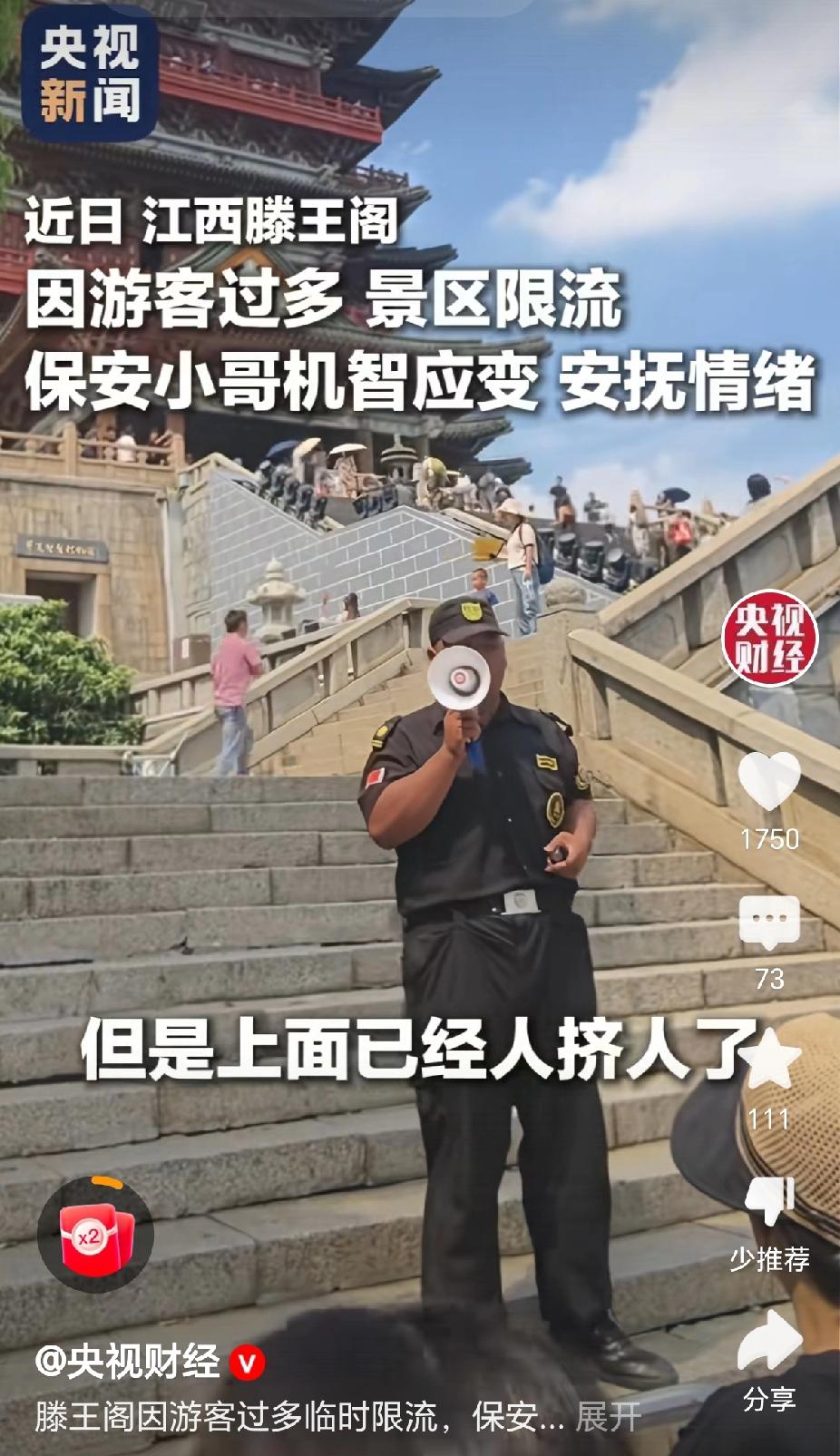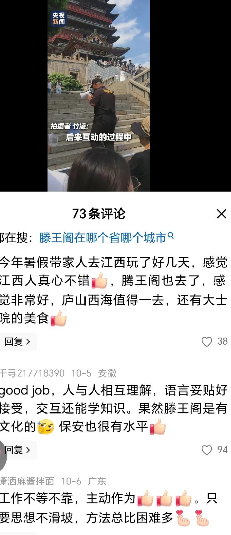 “学到了,滕王阁下保安小哥与游客有奖互动,让大家开心!”近日,江西南昌,国庆中秋长假期间,滕王阁景区迎来了大批游客,不得不采取限流措施,保安小哥的做法让游客开心了!(来源,央视财经) 据报道,长假期间,滕王阁景区非常火爆,阁楼上人挤着人,景区只好临时性采取限流措施,让阁楼上的游客下来后,才放下一批游客上去游览! 在这游客等待的过程当中,游客们都在太阳底下晒着太阳,心情有些烦躁,开始有些抱怨。这时候保安小哥提着一桶矿泉水,拿着扩音喇叭走向前来! “看到大家在晒太阳,我也不躲在树荫下边,上边已经是人挤人,上去也看不到什么景色。我们一起来玩个有奖问答吧!”保安小哥说,谁先答对将获得矿泉水一瓶。 “第一题,滕王阁的滕王叫什么名字?”保安小哥问道。“李煜”,有游客回答说。“回答错误!”保安小哥说。 “是李元婴、李元婴”!另一位游客将手举得高高的回答。“回答正确!”保安小哥,赶紧递上一瓶矿泉水,给予奖励! 在这个互动当中,大家都玩的很开心,不知不觉一轮限流就过去了,游客们有序的登上了滕王阁楼,观赏着这美景,回味着这沉淀的历史文化! “工作不等不靠主动作为,给保安小哥点赞!只要思想不滑坡,办法总比困难多!”有网友评论说,滕王阁的保安小哥素质太高了! “今年暑假带家人去江西玩了好几天,感觉江西人真心不错!”有网友评论说,滕王阁也去了,感觉非常好。 是呀,每个人在自己的岗位上随机应变,安抚情绪,让在外出行的人们能够有更好的体验,这就是我们不管从事什么工作,所获得的价值! 对此,你的看法是怎样的呢? 滕王阁限流保安小哥机智应变 @秋实99 关注人生冷暖,拥抱幸福生活!
