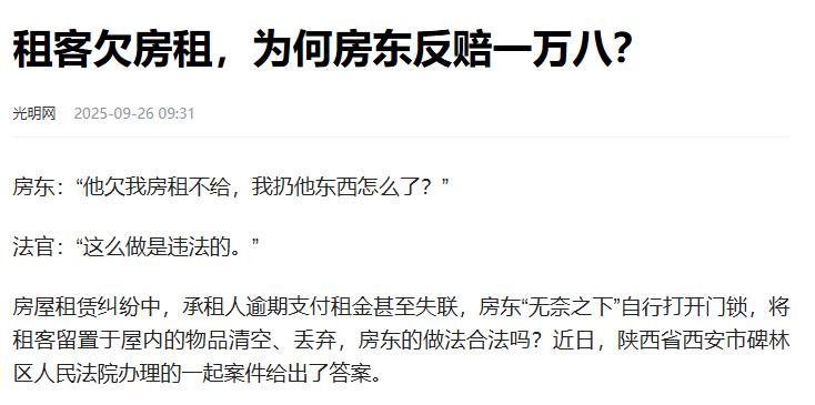 “冤不冤?”陕西西安,租客拖欠房租,还失联了,房东无奈之下拿备用钥匙进入房间,清空房间以便后续租给他人。万万没想到,租客得知后,反手将房东告上法庭,要求房东进行赔偿,房东懵了,认为自己是依照合同办事!法院这样判! 西安的房东张先生(化名)将自己的一套两居室出租给了李先生(化名)。双方签订了详细的租赁合同,合同中明确规定了租金支付方式、支付时间以及违约责任等条款。按照约定,李先生应在每月初支付当月租金。起初,李先生还能按时交租,可后来情况发生了变化。 连续几个月,李先生开始拖欠房租。张先生多次通过电话、短信联系李先生,起初李先生还会找各种理由拖延,称自己资金周转困难,承诺会尽快补交。但随着时间的推移,李先生不仅没有补交房租,还逐渐失去了联系。电话不接,短信不回,仿佛人间蒸发了一般。 张先生面临着两难的境地。一方面,房子一直空着收不到租金,自己要承担经济损失;另一方面,又不知道租客何时会回来,房间里的物品也无法处理。在多次尝试联系租客无果后,张先生想到了合同中的相关条款。合同里规定,若租客拖欠房租超过一定期限,房东有权收回房屋并处理屋内物品。 于是,张先生拿着备用钥匙进入了房间。房间里堆满了李先生的个人物品,包括衣物、书籍、一些生活用品等。张先生觉得这些物品长时间放置在这里也不是办法,为了尽快将房子再次出租,减少自己的损失,他决定清空房间。 他把李先生的物品进行了整理,一部分认为有价值的存放在了附近的仓库,并留下了联系方式告知租客物品存放地点;另一部分觉得没有太大价值的就进行了处理。 然而,让张先生万万没想到的是,几个月后,李先生突然出现了。当他得知自己的物品被房东清空后,十分愤怒。李先生认为,即使自己拖欠了房租,房东也没有权利私自处理他的物品,这侵犯了他的财产权。于是,李先生一纸诉状将张先生告上了法庭,要求张先生对他的损失进行赔偿。 张先生接到法院传票后,整个人都懵了。他觉得自己完全是依照合同办事,租客拖欠房租在先,自己多次联系无果后才采取的措施,怎么就成了被告呢? 案件进入审理阶段后,法院对双方提供的证据进行了详细审查。张先生提供了租赁合同、多次联系租客的记录等证据,证明自己是在租客严重违约且失联的情况下采取的行动。李先生则提供了部分物品的价值证明,声称自己因此遭受了经济损失。 判决下来后,张先生虽然觉得有点委屈,但还是按判决履行了赔偿,小吴也交了拖欠的房租。这件事在网上传开后,网友们讨论得特别热烈。有网友说 “租客失联欠房租不对,但房东也不能自己随便搬东西,万一里面有贵重物品说不清楚”; 也有网友说 “遇到这种事真头疼,下次租房一定要把违约条款写清楚,最好找正规中介”;还有网友分享自己的经历 “之前我也遇到过租客欠租,先找了居委会见证,再请律师发函,最后才走法律程序,虽然麻烦但没出问题”。