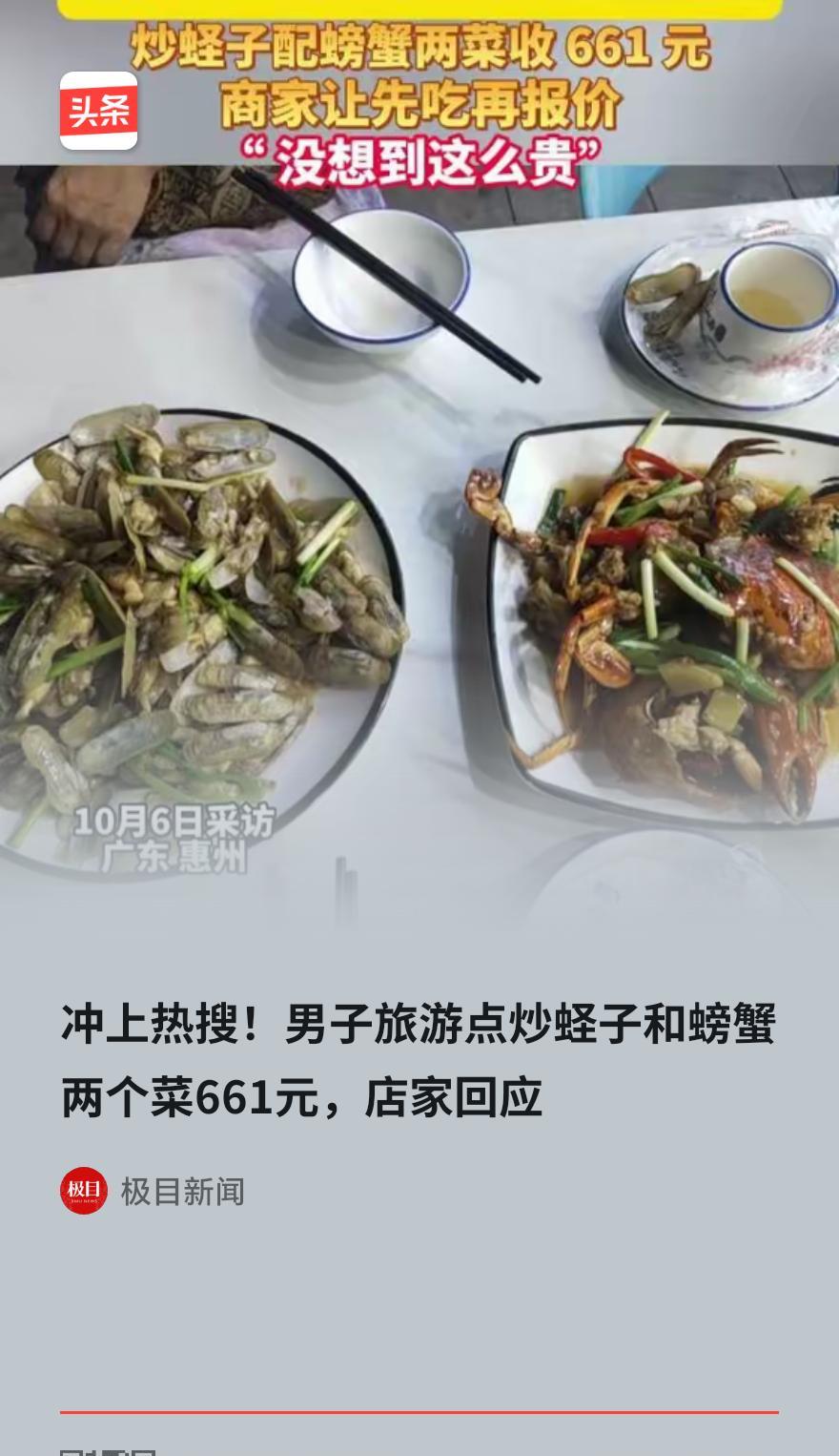 😡国庆吃俩菜被收661元!连云港老板:按市价!游客怒了:螃蟹是金子做的?