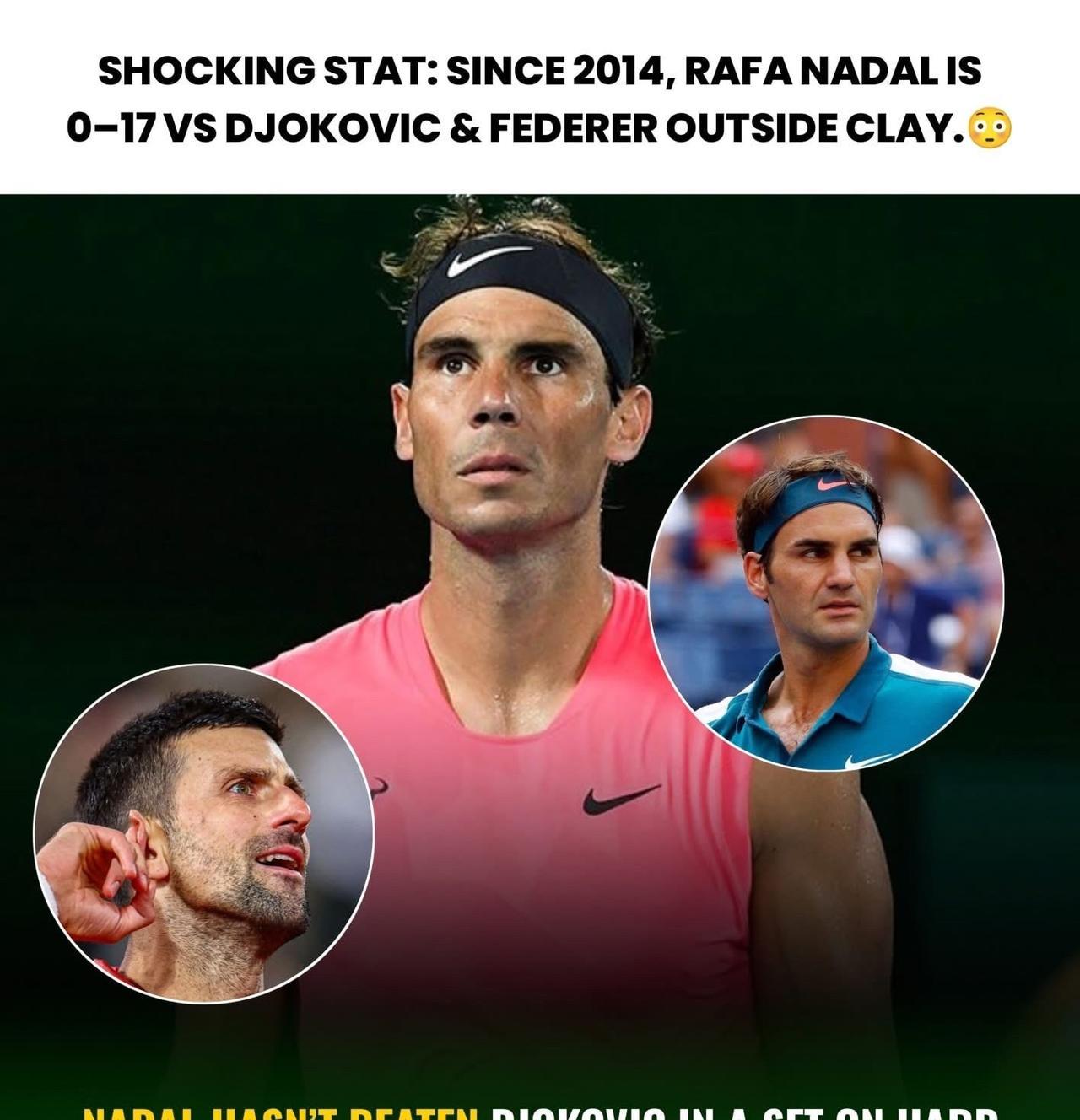 自2014年以来,拉法·纳达尔在非红土赛场上面临着严峻的现实,他在自己最擅长的场地之外与诺瓦克·德约科维奇和罗杰·费德勒的17场比赛中全部落败。他在硬地赛场上对阵德约科维奇的战绩尤其惨淡,自2013年以来未尝胜绩。与此同时,38岁的费德勒最近也占据了主导地位,纳达尔已经连续6场输给了瑞士天王。即便纳达尔在硬地赛场上如此糟糕,但自2013年以来仍然在硬地赛场上赢得了4个大满贯。比穆雷或瓦林卡的职业生涯总成绩更好,而非红土赛场上总共赢得8个大满贯,他的职业生涯堪比阿加西、贝克尔等人,只是他恰好在红土赛场上表现太过出色而已。#网球#