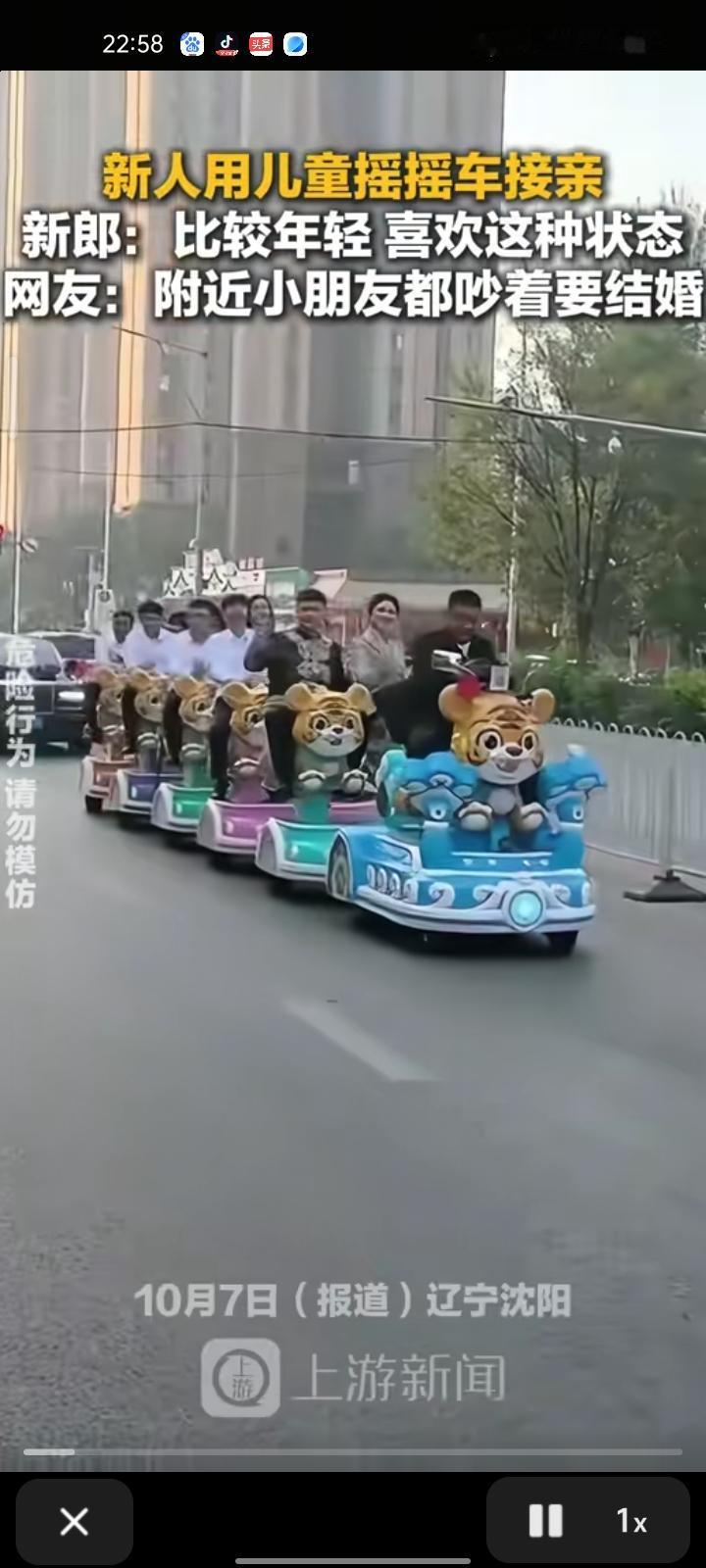 10月5日,辽宁沈阳。新人用儿童摇摇车接亲,有网友称附近小朋友都吵着要结婚。当事人表示,比较年轻,也比较喜欢这种状态,也确保在没有车安全的情况下才过的道。把新娘从她住的宾馆接到我的新房,总共几百米,然后接亲就给她接回来了。