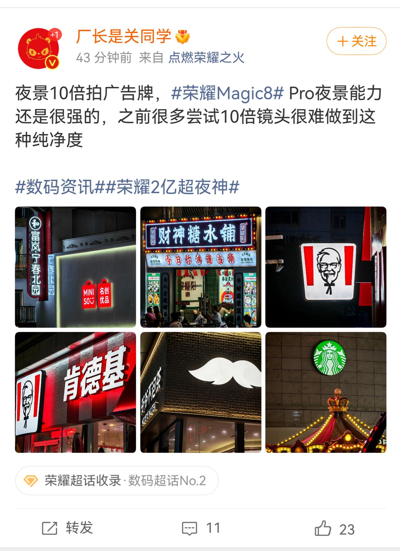 荣耀Magic8Pro的10倍夜景表现果然强悍。近日,数码大佬厂长是关同学拿到