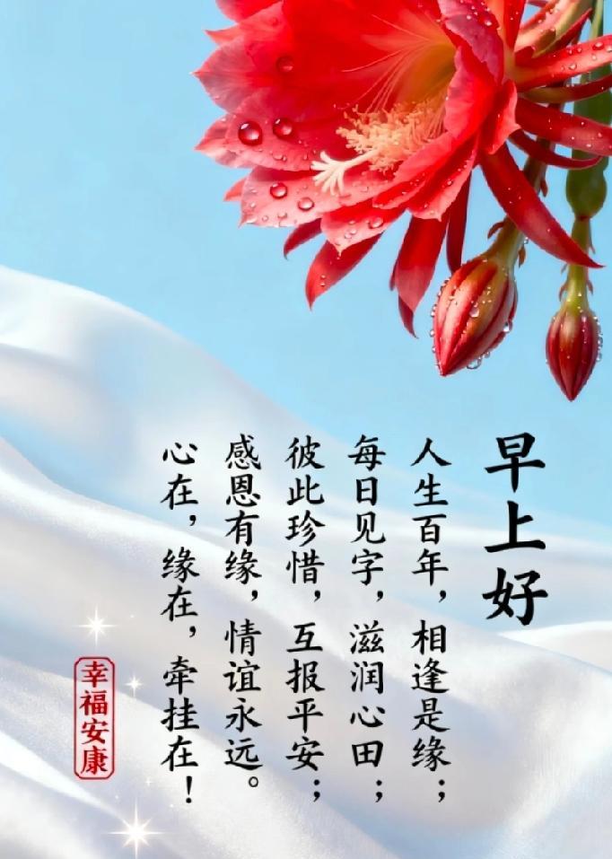 [玫瑰]早上好[玫瑰] 善良是光,照亮前路; 宽容是海,容纳百川。 心若向阳,无惧风霜; 人若向善,福运绵长。 新的一天,好运常伴! 人生百年,相逢是缘; 每日见字,滋润心田; 彼此珍惜,互报平安; 感恩有缘,情谊永远。 心在,缘在,牵挂在! [太阳][玫瑰][心][微风] 一个深深的祝福, 我们都平平安安, 一个甜甜的问候, 我们都快快乐乐, 一个浓浓的心愿, 我们都健健康康!