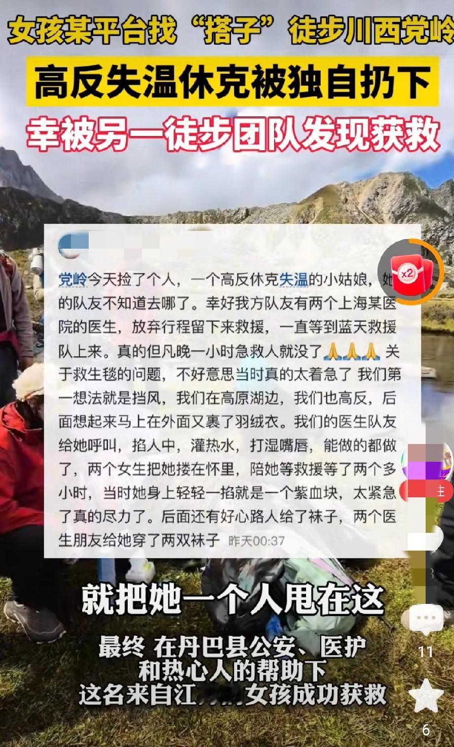 现在这年头,找个“搭子”太容易了。吃饭有饭搭子,看电影有影搭子,连出个门旅游,都能在网上速配一个临时旅伴。这种轻巧的社交方式,主打一个高效陪伴,不深入、不纠缠,解决了无数都市人的孤独感。 但这种“轻关系”真的扛得住事儿吗?一旦把它从咖啡馆、电影院,扔到需要把后背交给对方的极限环境里,它会变成什么样?10月6日海报新闻报道的一件事,就像一盆冰水,浇醒了很多人。 在川西党岭,一个独自徒步觉得孤单的女孩,就这么干了。她上网找了个“搭子”,心想万一出点事,好歹身边有个人能搭把手。这个想法,代表了太多人对“搭子”的美好滤镜。 可她们要去的地方,是海拔超过4000米,甚至有说法是4700多米的高山。这已经不是散步,而是一场挑战。女孩很快就倒下了,严重的高反、失温,最后直接昏迷,动弹不得。 这就是考验人性的时刻。那个被她寄予厚望的“搭子”,是怎么做的?他走了。就这么走了,独自一人,消失得无影无踪。别说救助,别说背她下山,他甚至连个求救电话都懒得打。 这种建立在网络上的临时组合,本质上就是个功能性的搭伙,根本不是什么责任共同体。指望一个萍水相逢的陌生人,在生死关头为你豁出去,这本身就是一场拿命在赌的豪赌。 当女孩生命垂危,命悬一线时,真正的转机出现了。另一支路过的徒步团队发现了她。这些素不相识的驴友,没有丝毫犹豫,立刻上前查看情况,展开急救。 正是这些热心的陌生人,把女孩从死亡线上拉了回来。他们让她恢复了意识,并和后来的专业救援队一起,把她安全带下了山,送进医院。女孩脱离了危险。 你看,这事儿多讽刺。你精心挑选的“搭子”,在你最需要他的时候,把你当成累赘一样抛弃。而一群完全不相干的路人,却成了你的救命恩人。这简直是人性光谱的两个极端。 那个“搭子”的行为让人愤怒,但更值得反思的,是女孩自己。她犯的最大错误,就是把自己的安全感,轻率地寄托在一个虚无缥缈的网络关系上。 这起事件给我们敲响了警钟:社交可以“轻”,但生命之“重”,开不起任何玩笑。搞这种高风险的活动,要么找专业的团队,要么和信得过的亲友同行,这才是对自己负责。 享受网络社交的便利没错,但我们必须清醒地知道每一种关系的边界在哪。对于那些需要托付生死的挑战,我们需要的绝不只是一个临时的“搭子”,而是一个能真正把后背交给他的伙伴。 信息来源:海报新闻 2025-10-6