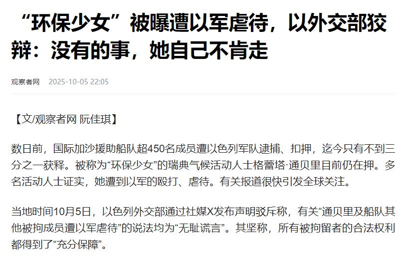 以色列外交部嘲笑了瑞典环保少女格蕾塔·通贝里“作秀”,称格蕾塔的船队只带了2吨人道援助,还不到一辆卡车载重的1/10。而以色列每天向加沙运送300辆卡车,每辆卡车载有20吨的国际组织的人道援助。 以色列这话听着感觉有些道理,但仔细一琢磨全是漏洞,结合现实更是将其的虚伪暴露无遗。 格蕾塔加入的这支叫"全球坚韧船队"的民间队伍,共四十多艘民用船从意大利出发,想冲破以色列对加沙的海上封锁,给当地送点药品和食品。 船队出发前就心知肚明,大概率会被以色列拦截,但他们要的不是"送成多少物资",那只是杯水车薪解决不了问题,他们是想让全世界看看以色列封锁加沙的真实嘴脸。 而以色列的反驳看似有理有据,可数据一扒就露馅了。最明显的漏洞就是"每辆卡车20吨"这个说法。 事实上,以色列对加沙的援助物资品类卡得特别死,燃料、建筑材料这些重东西基本不让进,能送的大多是食物、水、保暖物资这类轻量级物品。 这些东西密度小,就算把卡车塞得满满当当,也根本不可能达到20吨。单从这一点就能看出,以色列的说辞从头到尾都透着谎言和虚伪。 再说说"每天300辆卡车"的水分,以色列自己的COGAT机构喊着这个数,但加沙地带媒体办公室的真实统计显示,整个9月进加沙的卡车总共才1824辆,平均到每天还不到60辆。 而且这些为数不多的物资,分配权还攥在以色列手里,加沙民众能不能拿到、能拿到多少,全看以色列脸色。所谓的"国际援助",更像是以色列用来装点门面的工具。 加沙现在有多缺物资?联合国的报告说得明明白白:北部粮食供应比9月中旬少了70%,三分之二的房子被毁掉,医院因为缺燃料,好多科室都被迫关门。 按照国际人道主义标准,加沙每天至少需要500到600辆卡车的物资,才能勉强维持基本生活。可以色列连自己吹嘘的"300辆"都是假的,更别说满足实际需求了。他们嘴上说"避免人道灾难升级",实际上就是把饥饿当成了谈判的筹码。 以色列拦截船队的手段也挺难看,船队成员说以军在国际水域就动手了,用水炮喷船、干扰通信,甚至直接撞船。四百多个志愿者被扣押,挤在拥挤的牢房里,有的连饭和药都得不到。 有意思的是,以色列越想靠数据转移视线,越暴露了封锁政策的残酷。格蕾塔虽然被捕,但这场风波反而让更多人关注到加沙的困境。 南非、土耳其等国纷纷发声谴责以色列,西班牙甚至召见了以色列的外交官。社交媒体上,“释放格蕾塔”和“加沙不被遗忘”的话题热度一直降不下来,普通民众都在用自己的方式声援加沙。 说到底,这场争议的核心从来不是"2吨物资"和"20吨卡车"的数字游戏,而是以色列对加沙的封锁是否合理。格蕾塔的船队或许没能把物资送进去,但他们成功撕开了以色列"人道卫士"的伪装。 就像船队的一位志愿者说的:"船可以被拦,人可以被扣,但加沙民众的苦难和真相,永远不可能被封锁。"
