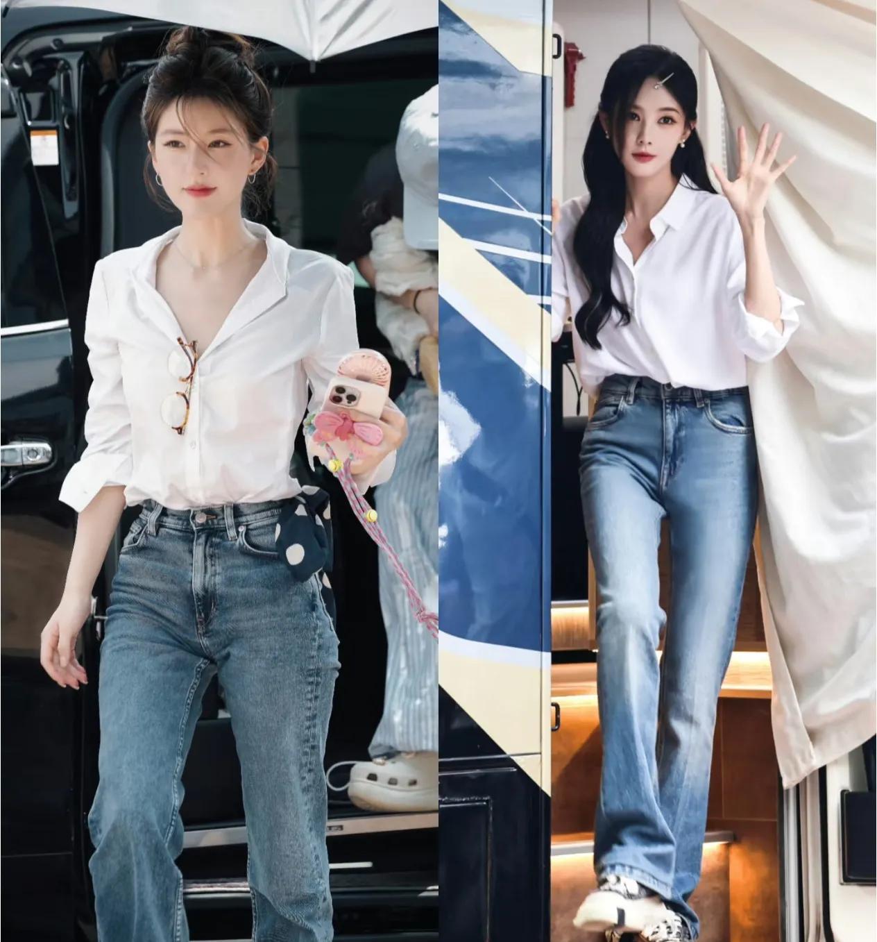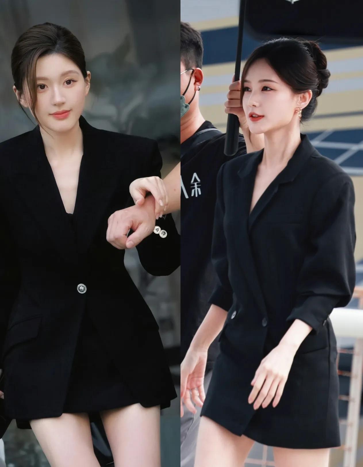 emm,这就有点难评了! 今天刷到很多人在吐槽李一桐新剧路透出来的造型和赵露思的很像, 说实话一开始有点不以为意, 因为白色衬衫加牛仔裤属于基本款穿搭, 很多剧女生都这么穿! 那套黑色套装也算是比较流行偏大众, 毕竟黑白灰是永恒的流行色, 但那个V领就有点难评了, 加上这么多撞款, 让人想问这两部剧的造型师是同一个人吗?
