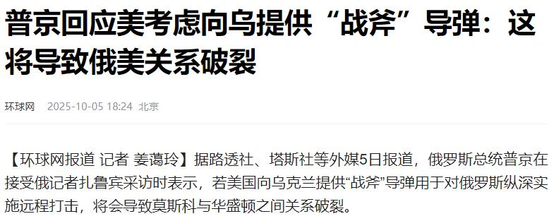 10月5日,俄罗斯总统普京明确宣布:如果美国向乌克兰提供“战斧”巡航导弹,将摧毁