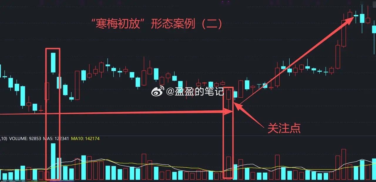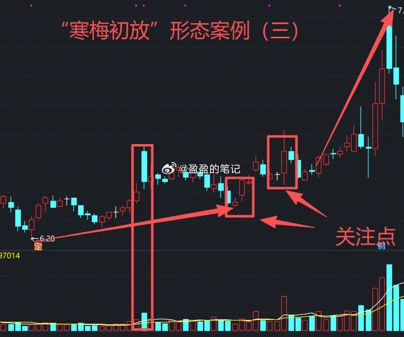综上所述,“寒梅初放”形态走势并不是急促的,有很长的时间去分析研判,不可以提前大仓位,放量才是大幅加仓机会。