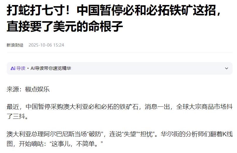 中国买矿石坚持用人民币,不玩美元那一套了。美国让澳大利亚必须用美元卖,结果自己又不用矿石,没法接盘。澳大利亚夹中间没办法,只能听中国的。现在越来越多国家愿意收人民币,毕竟被美元卡过脖子的都懂,手里有选择才踏实。 大家都知道,中国是全球最大的铁矿石进口国,而澳大利亚则是主要的出口国。 数据摆在那:澳大利亚7%的GDP都靠铁矿石出口撑着,其中85%的铁矿石都卖到了中国市场。以前双方交易一直用美元,澳大利亚早就习惯了这种模式。 但随着我们提出用人民币结算,美国率先跳出来反对,逼着澳大利亚必须继续用美元卖矿。可美国自己的处境却很矛盾——它每年从澳大利亚进口的铁矿石还不到1%,根本没法消化澳大利亚那庞大的产能,说白了就是“自己不买还不让别人换结算方式”。 这就把澳大利亚夹在了中间,一方面是“盟友”美国的压力,另一方面是最大买家中国的需求。 更让澳大利亚着急的是,中国早就做好了两手准备:不仅和巴西淡水河谷签订了每年5000万吨的人民币长期采购协议,还在几内亚的西芒杜铁矿项目上砸了上百亿美元,就是为了保障铁矿石供应的多元化。 澳大利亚一看这情况,要是真跟中国闹僵,自己的矿场里堆着的铁矿石可就没人买了,到时候企业亏损、工人失业都是大概率事件。 权衡之下,澳大利亚只能做出妥协。全球矿业巨头力拓率先松口,同意对华铁矿石出口采用人民币结算。这可不是小事,背后牵动的是整个铁矿石贸易体系重构的开始。 中国紧接着在海南自贸港推出了“人民币海漂铁矿石掉期”业务,新加坡交易所也跟着上线了人民币铁矿期货,北京还发布了自己的铁矿石现货价格指数。 这些操作直接打破了以前西方机构垄断铁矿石定价权的局面,中国企业用人民币结算时,再也不用受美元汇率波动的影响。有钢铁厂算过一笔账,光是汇率对冲这一项,每年就能省下好几亿美元。 中国的这个举动,也让其他被美元“卡过脖子”的国家看到了新选择。以前不少国家都吃过美元霸权的亏:伊朗有70亿美元外汇被美国冻结,委内瑞拉3.42亿美元资产被强行转给反对派,阿富汗央行的救命钱至今还在美国账户里取不出来。 现在看到人民币能在大宗商品贸易中发挥作用,这些国家纷纷开始尝试“去美元化”:沙特在琢磨把亚洲原油贸易改成人民币计价,印度加速推进和俄罗斯的卢比-人民币结算试点,土耳其直接用人民币买黄金。 美国这下是真着急了。要知道美元霸权的根基,很大程度上靠的是“石油-矿石”这两大宗商品的美元计价体系撑着。现在铁矿石这条腿先“瘸”了,美元在全球大宗商品市场的统治力自然会受影响。 更关键的是,中国正在构建“资源输入-货币输出-制成品回流”的经济闭环,从澳大利亚的铁矿石到巴西的大豆,再到非洲的锂矿,越来越多资源类贸易开始用人民币结算,美元的“世界货币”光环正在慢慢褪色。 这场没有硝烟的货币博弈才刚刚开始。澳大利亚的妥协只是一个起点,随着人民币跨境支付系统覆盖189个国家,离岸人民币存款突破1万亿元,越来越多国家会发现,手里握着人民币不仅能稳定买到需要的资源,还能规避被美国制裁的风险。