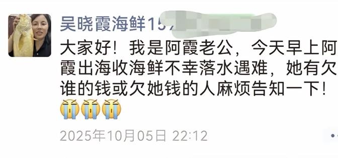 石砰网红阿霞在10月5号早上出海时从快艇掉下来溺亡,她的粉丝开始都不愿相信,后来其丈夫发文证实是真的。 刷到过阿霞的作品,教大家如何挑海鲜,也卖海货,闽南曲唱得也好听,70后,一个豪爽又能干的女人。 有知情人透露是出海时从快艇掉了下来,开快艇的男人下水去救,但也不幸溺亡了。 有说他们当时穿着救生衣,有说没穿的,海边长大的人,按说水性应该都不错,但海上情况复杂,风速、海浪等等危险因素太多了。