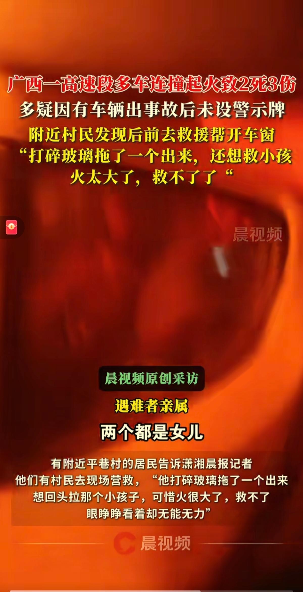 这消息太令人痛心了! 国庆返程路上,高速路上车祸,两个小女孩被活活烧死! 10月4日晚上19时许,广西玉林一高速路上发生一起5车追尾事故,造成2人死亡,3人重伤。据死者亲属说:“堂哥一家4人开车旅游,堂哥、堂嫂以及两个女儿。遇车祸,堂嫂重伤,两个小侄女意外死亡。” 现场车主回忆:“路过高速路段,事故车辆撞到绿化带,停靠在旁边,没有开启车辆应急双闪,也没有设置警示标志。”有的车主注意到了,紧急刹车后开走了,后来的车辆的车辆就没有那么幸运,夜间光线不好,导致后来车辆刹不住车,造成5车追尾,现场燃起熊熊大火,附近的村民砸碎玻璃救出一人,想返回去救小孩,火太大了,2个小孩被活活烧死了,一个才上六年级,一个才四五岁,车主的妻子被严重烧伤…… “道路千万条,安全第一条!”国庆期间,车流量大,开车尤其要小心,遵守交通规则!快快乐乐出门去,平平安安归家来!不要有什么侥幸的心理! 网友评论: 每年逢年过节的车流量高峰期,都会出现不同的交通事故,不仅造成财产损失,更危及人的生命。 这个时候千万不要一个人拉着全家一起出去旅游,不怕一万,就怕万一,就怕后悔! 如果真的要出门旅游,尽量选择那些公共交通,毕竟那些司机是专业培训上岗的,遇见点突发情况能够及时处理,又稳当又安全! 遵守好交通规则,不要存侥幸心理,一时侥幸,付出的是惨痛的代价! 不管如何,希望这样的悲剧不要再发生! 车祸现场 车祸 高速连环事故 汽车高速事故