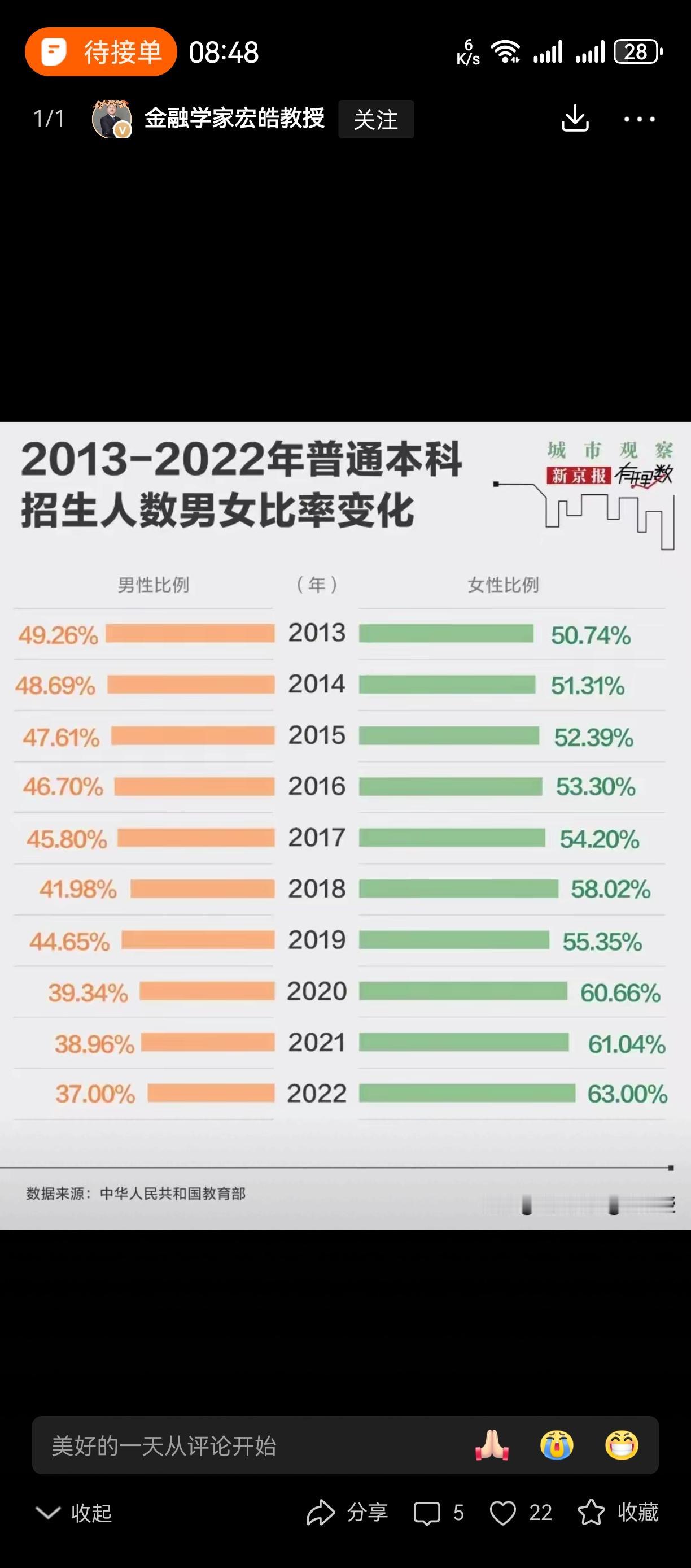 男的干不过女的![强]女生也很能干 主要是学习上, 有数据报道百分之六七十大学 , 尤其是好的大学, 都是女生! 除了女生学习习惯好, 自律以外, 跟男生看黄色网页, 不自控外。 就是男生懂事晚, 等真正懂事, 已经被好高中分流掉了! 注定差学校, 没有办法[大笑]男女有差别 学生男女关系