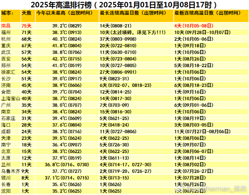 【离谱的气温 错乱的季节】今天湖南江西站点包揽高温榜前十,湖南攸县38.4℃排名第一。湖北神农架31.5℃打破当地10月最高气温纪录。今天省会城市只有南昌出现高温,未来5天南昌高温继续,全年高温日数将达到创省会纪录的80天。此外未来5天当中,武汉长沙重庆杭州福州广州也有可能出现高温,热得像7-8月。