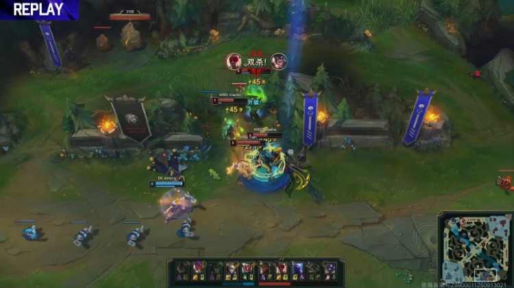 [23:15]河道团战,DK正面毫无一战之力,WBG追击至野区瞬间击杀DK中野,Light飞机强势击杀Aiming,小天收掉残血Siwoo兰博,WBG打出1换5团灭DK,经济领先1w。