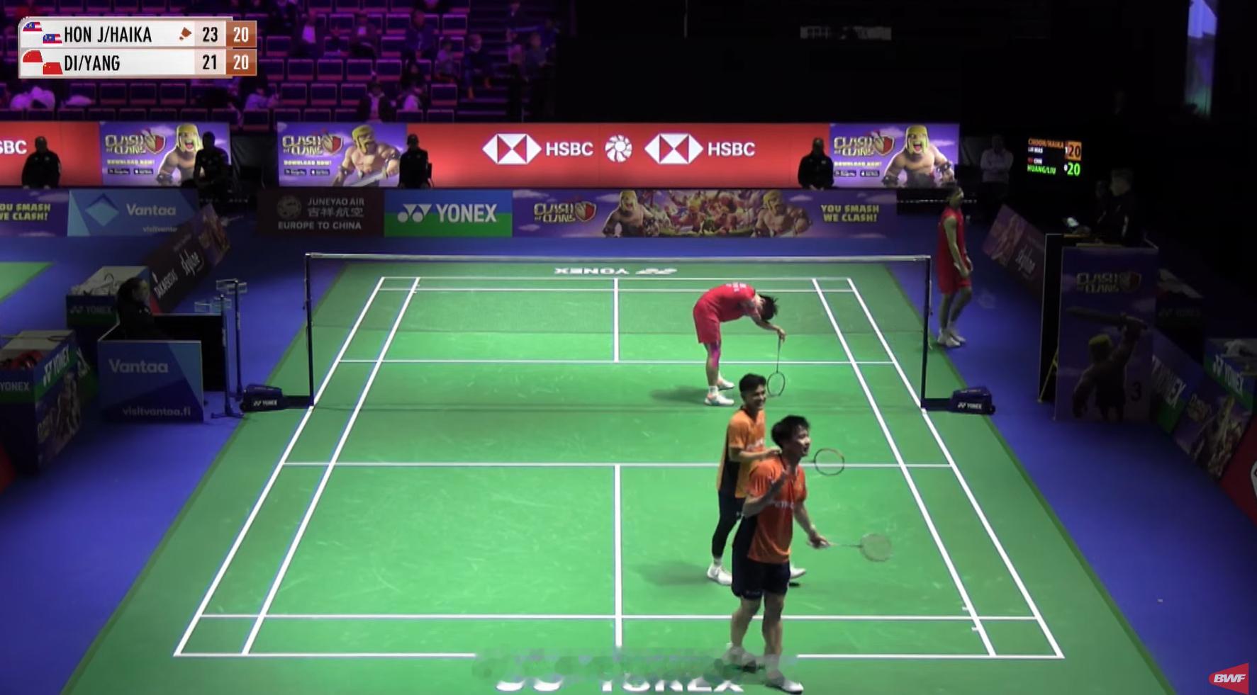 刘阳网前一个扑球后被裁判罚了一个违例,比分变为20-20