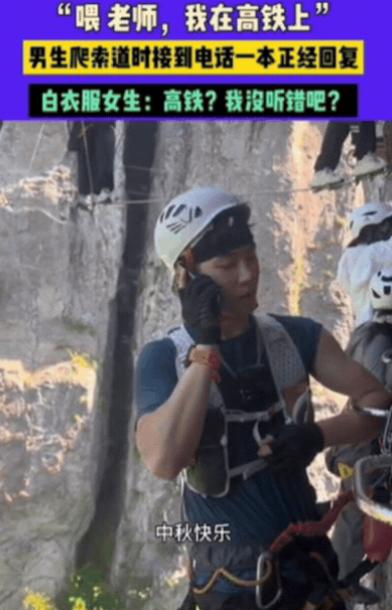 笑不活,浙江,一小伙在爬高空索道时,突然接到老师打来的电话,结果小伙接起电话后,
