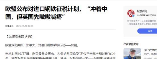欧盟这是完全讨打的行为,我们肯定不会惯着!10月8日,根据法新社报道,欧盟突然对我们出手了。欧盟委员会公布史无前例的措施,包括将进口关税加倍,以保护正在遭受中国日益激烈的“不公平竞争”冲击的欧盟钢铁业。不仅如此,欧盟还宣布,将每年可免税进口到欧盟的外国钢铁配额减少47%。 也就是说,免税配额钢铁将减少至1830万吨。欧盟委员会副主席塞若表示:欧洲钢铁行业正处于崩溃的边缘。我们将保护它,以便它能够投资、脱碳,从而重新恢复竞争力。法媒表示,中国被指维持产能过剩,压低全球价格,结果导致许多欧洲钢铁厂关闭。 但欧盟这招棋显然下错了,先看看欧盟钢铁业的现状。欧盟目前有500多个钢铁生产基地,直接雇佣30多万人,间接支撑250万个就业岗位。可这些钢铁厂大多设备老旧,能源成本高得离谱。 俄乌冲突后,欧洲天然气价格暴涨,钢铁企业的电费、燃料费跟着翻倍,生产成本直线上升。比如德国蒂森克虏伯,2024年光能源支出就增加了1.2亿欧元,导致炼钢成本比中国同行高30%以上。这种情况下,欧盟钢铁企业本来就竞争不过中国产品,现在还把锅甩给中国产能过剩,这不是自己没本事还怪别人跑得快吗? 再说说欧盟所谓的“产能过剩”,中国钢铁产量确实全球第一,但出口量只占总产量的10%左右,而且大部分是中低端建筑钢材。欧盟从中国进口的钢铁里,60%是热轧板卷这种基础材料,这些产品技术含量低、利润薄,欧洲企业早就不愿意生产了。 而真正让欧洲钢铁厂倒闭的,是他们自己产业升级失败。比如意大利的达涅利集团,因为不愿意投资电炉炼钢技术,还在用传统高炉,结果被中国企业用更环保的工艺抢走了市场。现在欧盟反过来指责中国“压价倾销”,这就好比自己考砸了怪别人卷子印得太清楚。 欧盟这波操作对自己的伤害更大,首先是钢铁价格必然上涨。欧盟钢铁进口量里,有40%来自中国。现在配额减少、关税提高,欧洲市场上的钢材供应肯定吃紧。德国工业联合会预测,2026年欧盟热轧板卷价格可能涨到800欧元/吨,比现在高出20%。这对德国汽车制造业来说是致命打击。大众集团测算,一辆汽车的钢材成本占比约15%,如果钢材涨价20%,每辆车的生产成本就要增加1200欧元。到时候德国车在国际市场上还怎么和中国电动车竞争? 其次是欧盟的通胀压力会加剧。钢铁是工业的基础材料,建筑、机械、家电哪个行业离得开它?钢材涨价会像多米诺骨牌一样传导到下游产业。欧盟统计局的数据显示,2024年欧盟核心通胀率已经达到5.3%,如果钢铁关税政策实施,预计2025年通胀率可能再升0.5个百分点。这让欧洲央行的加息压力更大了,老百姓的日子只会更难过。 更搞笑的是欧盟想通过关税倒逼钢铁业脱碳,结果可能适得其反。欧盟要求钢铁企业2050年前实现碳中和,可他们的钢铁厂大多是高耗能的高炉-转炉工艺,要改成低碳的电炉炼钢,每个钢厂至少需要50亿欧元的投资。现在欧盟用关税保护这些落后产能,企业反而没有动力升级技术。比如安赛乐米塔尔在法国的工厂,本来计划2026年上马氢基直接还原铁项目,现在有了关税保护,管理层居然考虑推迟投资,先把钱用来分红。这样下去,欧盟钢铁业的碳排放只会越来越高。 中国当然不会坐视不管。我们已经有了反制手段。一方面,中国可以对欧盟的汽车、化工产品加征关税。欧盟对中国钢铁加税,我们就对德国汽车下手。中国是德国汽车的最大出口市场,2024年大众、宝马在中国的销量占全球总销量的35%。如果我们对欧盟汽车加征25%的关税,德国车企一年可能损失50亿欧元的利润。 另一方面,中国可以加大对东南亚、中东等新兴市场的钢铁出口。2025年上半 年,中国对东盟钢铁出口同比增长了18%,泰国、越南的基建项目正在大量采购中国钢材。欧盟关上了门,我们还有其他窗户。 说白了欧盟这步棋走得太臭了,他们以为用关税就能保护本土产业,结果只会让自己的经济陷入更深的困境。中国有全球最完整的工业体系和14亿人口的大市场,根本不怕贸易战。反倒是欧盟,内部分歧严重,德国、法国等制造业大国反对钢铁关税的声音越来越大。欧盟委员会要是再执迷不悟,恐怕第一个被拖垮的不是中国钢铁业,而是他们自己的经济。这场钢铁关税战,欧盟注定是输家。 来源:观察者网 【欧盟公布对进口钢铁征税计划,“冲着中国,但英国先嗷嗷喊疼”】
