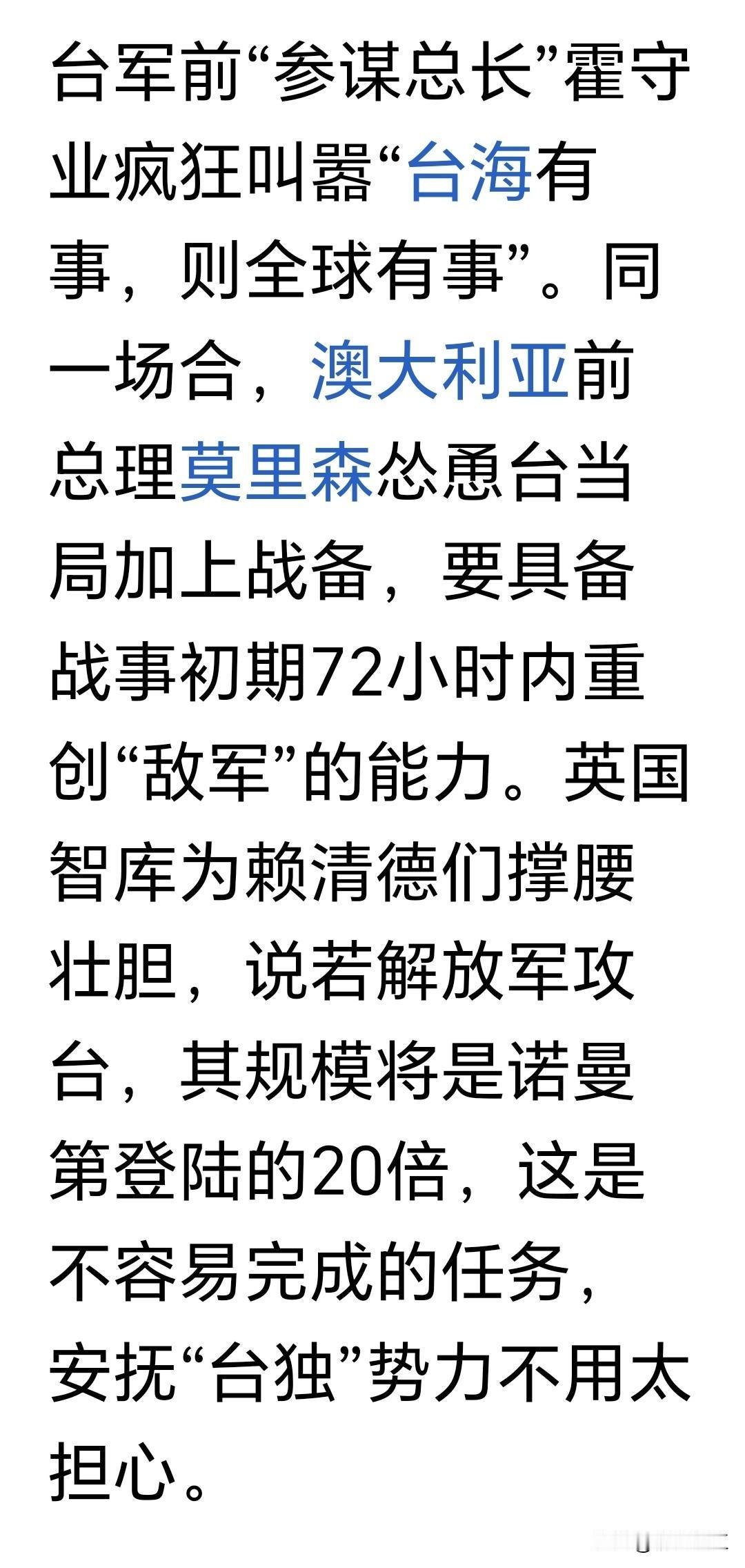 一边是台独势力在疯狂自嗨,其实心虚得很,甚至拉拢反华势力来给他们壮胆;一边是解放军加强训练,增强作战能力,再加上9月3日大陆展示的尖端武器,足以台独分子心惊胆颤,夜不能寐。反正外国反华政客站着说话不腰疼,他们所谓出谋献策只是动动嘴皮,但是战争的残酷结果却是两岸中国人来承受,他们起哄助战拱火备战,就是因为拿了台独势力民进党的钱来与台独分子合作表演而已。任凭它们如何表演,现实世界只相信实力,结果都只有一个剧终:实现祖国完全统一!