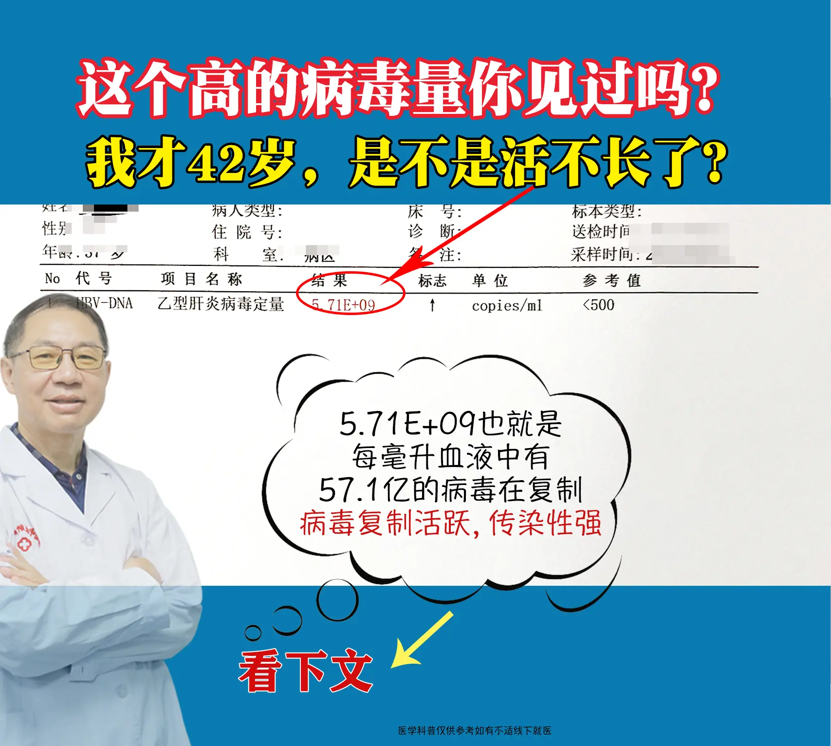最近接诊了一位 42 岁患者,前段时间因骨折检查,意外查出乙肝大三阳。每毫升血液里有50多亿病毒在复制,肝功能也亮了红灯,转氨酶200多、胆红素52,进一步检查还发现肝脏有明显炎症和肝纤维化,已接近早期肝硬化。