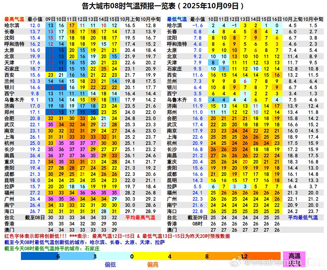 【气温创新低和创纪录】今晨南北方依然气温差异巨大,哈尔滨零下1.6℃为立秋后首次破零,此外长春0.8℃、太原7℃、天津7.9℃、拉萨5.5℃也创立秋后新低。南昌今晨最低29.1℃,再次打破10月最低气温的最高纪录。从天气形势看,北方的冷高压和南方的副热带高压都偏强,形成“关公战秦琼”的跨时空相聚。
