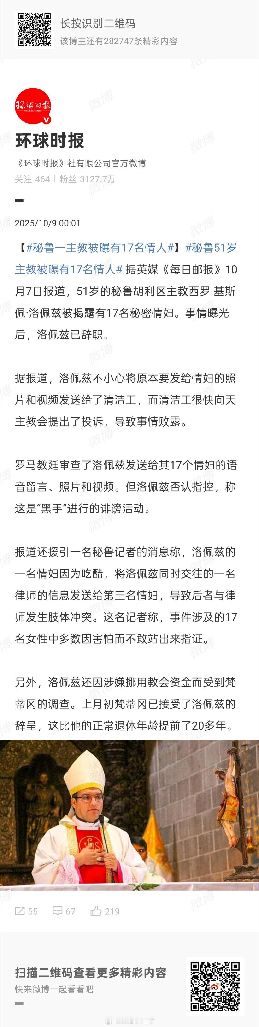 秘鲁一主教被曝有17名情人笑死了,网友说南美的主教比起欧美还是好一点,最起码人家