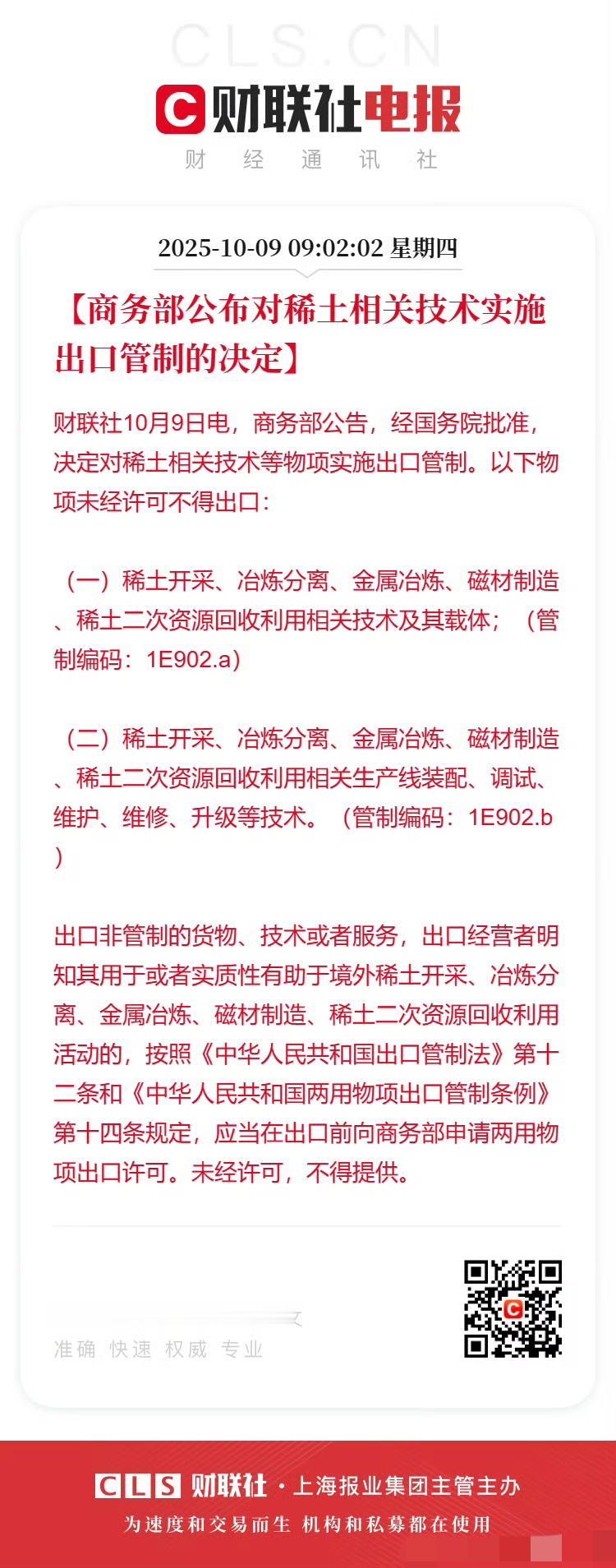 中国稀土管控再升级!商务部宣布对稀土相关技术实施出口管制。 据财联社10月9日