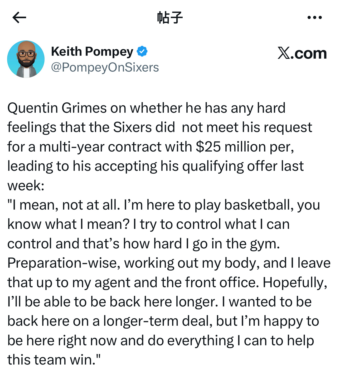 昆廷·格兰姆斯今日接受采访时,谈到自己是否对费城76人队未满足他年薪2500万美元的多年期合同要求感到不满,导致他上周接受了资质报价一事[围观]