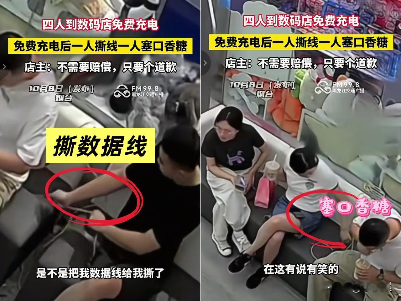 哈尔滨肖某鹏这波操作, 哪是丢自己脸? 是把“方便”俩字踩得稀碎! 全网说肖业鹏这四人悔青肠子,我看一点不冤! 去烟台店里免费充电,老板忙得没顾上,肖业鹏倒好,想顺充电器没成,直接把充电线全撕了! 同行女的还把口香糖塞凳子底下! 人家给你方便,你倒反过来添堵,这哪是不地道,是连最基本的分寸都没了! 别扯什么“丢东北人脸”,这跟地域没关系,就是几个人自己没素质。 老板没要赔偿就想要句道歉,肖某鹏还不承认,现在电话停机躲着,哪是怕“火”? 是怕面对自己干的破事。免费充电是店家的善意,不是让你顺手占便宜、搞破坏的机会,这点道理都不懂,难怪被全网说。 大家怎么看?
