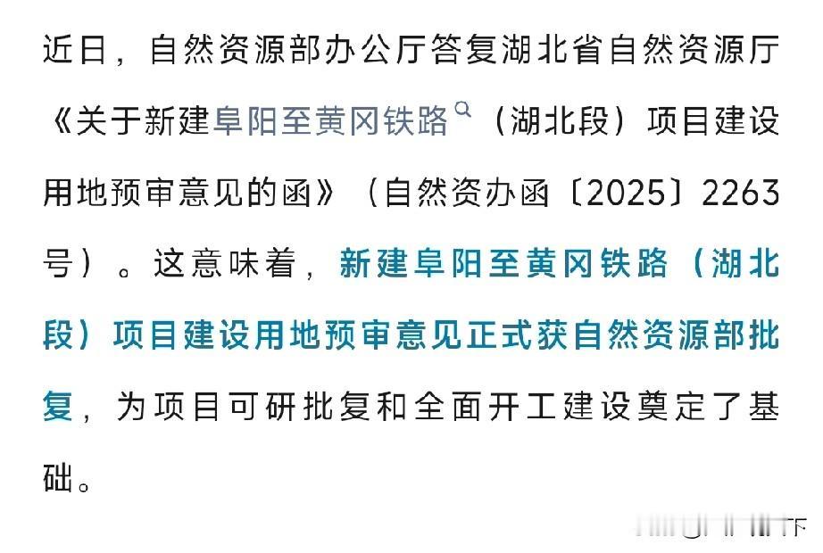 湖北省和安徽省的又一条重要高铁线路,阜阳至黄冈高铁有大推进 目前湖北和安徽两省合作,建设的最大的高铁项目,就是时速350公里/小时的合武高铁,预计2028年通车,比现有时速250公交/小时的合武动车速度更快,能让湖北省城市,特别是武汉市到达合肥,南京,苏州,上海等市时间更短。 综合湖北省,安徽省两省官方媒体消息,安徽阜阳至湖北黄冈铁路(湖北段),建设用地预审获得自然资源部批复,为项目全面开工建设奠定了基础。 阜阳至黄冈铁路的建设,除了可以加密鄂皖两省交通网络,同时对于阜阳市意义重大,在阜南县设站,阜阳可实现县县通高铁。京九线黄冈段 阜阳至黄冈段 阜黄高铁