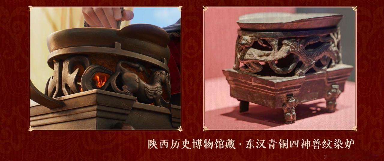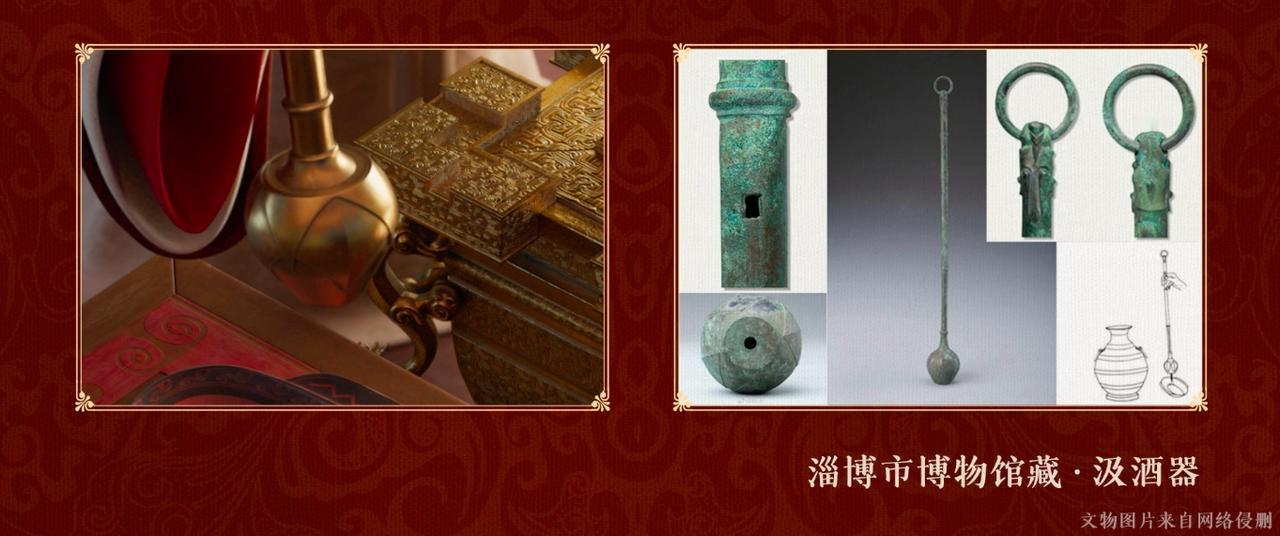 易中天居然拿历史文物当道具?假期带孩子吃一次博物馆“流水席” 1、电影的第一个重要道具就是一件只存在于西汉司马相如《美人赋》记载里的汉代香熏球。在没有汉代出土文物的情况下,美术团队参考了现存最大香熏球实物——“唐代鎏金双蜂团花纹镂空银薰球”的构造 。外观上则移植了汉代的花纹,让这件无人见过的汉代香熏球赫然眼前! 2、在讨董上曹操与袁绍发生分歧,当时的曹操一心匡扶汉室,主张出兵讨董,而袁绍则拥兵自重,观望局势。两人也就此分道扬镳。在“虎落平阳”的路上,曹操遇上一群恶狗在围攻一只中华田园犬,曹操见以多欺少,仗义相救。这只中华田园犬随曹操一起前往兖(yǎn)州陈留,招兵买马,伺机起兵,从此得名“麦子”。麦子的外形参考了内蒙古博物院的汉代彩绘陶狗 ,连麦子的铃铛都参考了汉魏洛阳故城遗址博物馆里的铃铛。 3、曹操身上穿的甲胄参考了淄博市博物馆铠甲,头盔参考了徐州博物馆的汉代甲胄,特别是他的“玄铁鳞甲”,这一套完整铠甲是超两千枚铁甲片手工编缀而成,是中国历史上铠甲制作的跨越式成就,也是中国甲胄的设计高峰。 4、曹操赴袁绍的“四州美食宴” ,两人把酒言欢, 用的玉杯是参考西安博物院的玉杯。用的漆耳杯,参考了湖南博物院的 “君幸酒” 三纹漆耳杯,是西汉时期的酒器。 5、吃饭的桌子,原型是湖南博物院的西汉云纹漆案。 6、吃鱼脍时配冻酒,存酒的冰鉴参考了湖北省博物馆的铜鉴缶。铜鉴缶由鉴和缶两部分组成,中间可以放置冰块,起到冰镇的作用,相当于现代的冰箱。 7、倒酒的金色器皿,是淄博市博物馆的竹节柄铜汲酒器。 8、热料汁的染炉,参考了陕西历史博物馆的青铜四神兽纹染炉。 9、乐手们演奏的乐器,参考了马王堆出土的,现存湖南博物馆的二十五弦瑟。