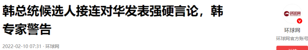 信息来源:《韩总统候选人接连对华发表强硬言论,韩专家警告》,环球网,2022年2月10日。