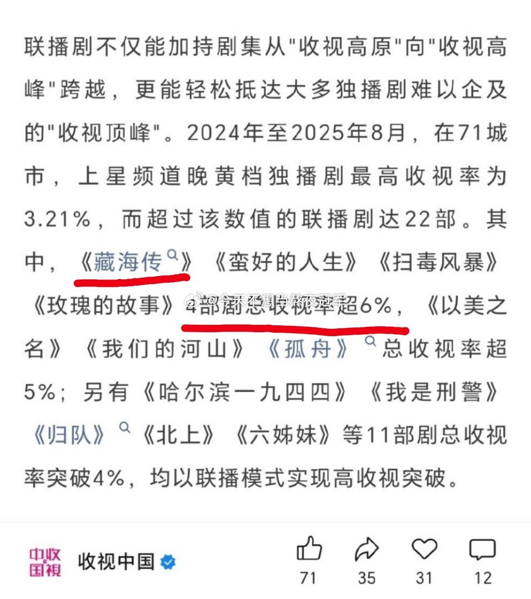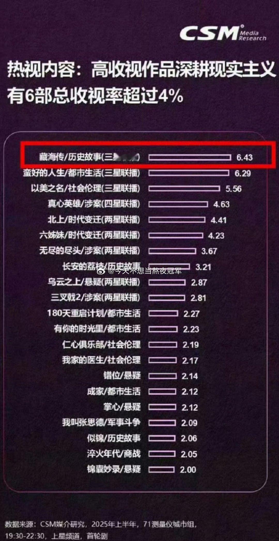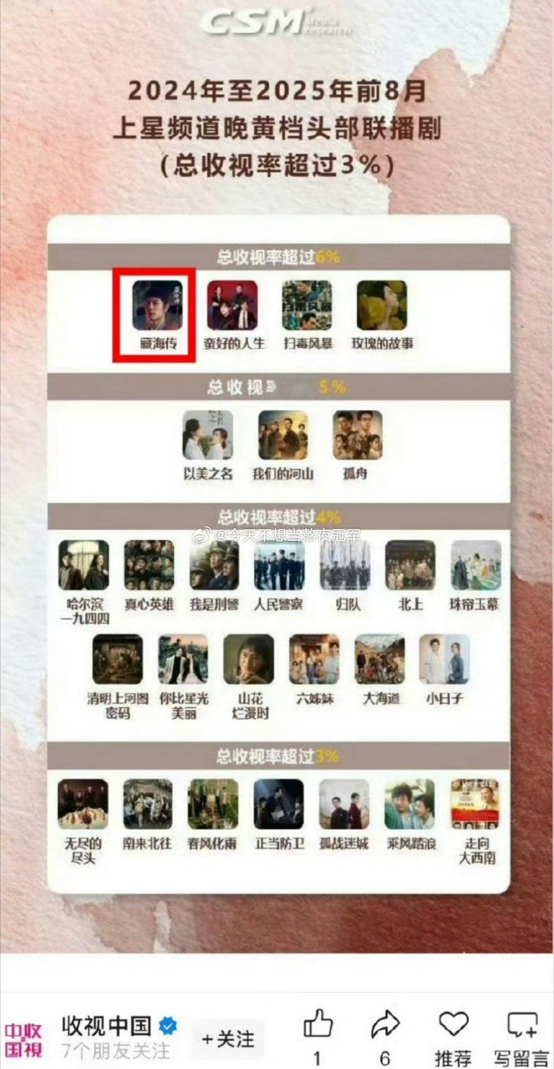tg. 广电认证,肖战《藏海传》以6.43%总收视率拿下2025上半年剧王。 2024年-2025年8月近两年内仅有4部剧总收视率超过6%, 其中《藏海传》稳居top1[吃馕][吃馕]