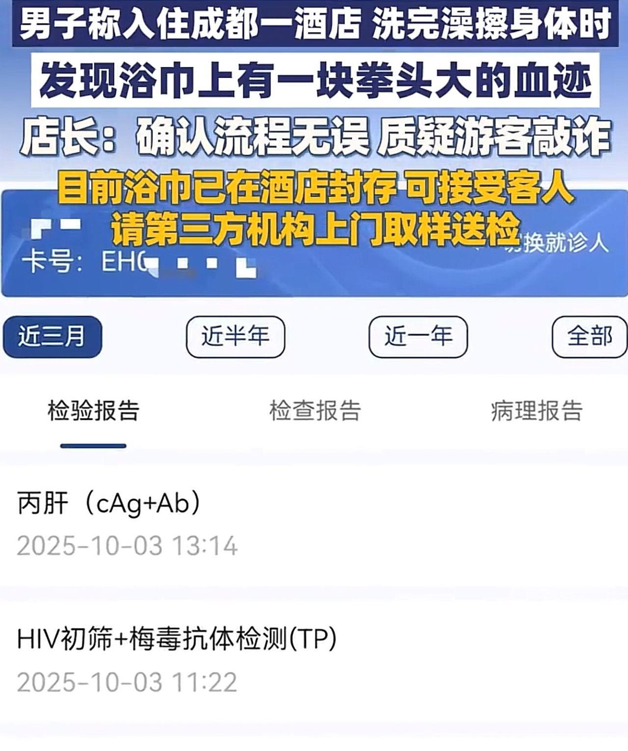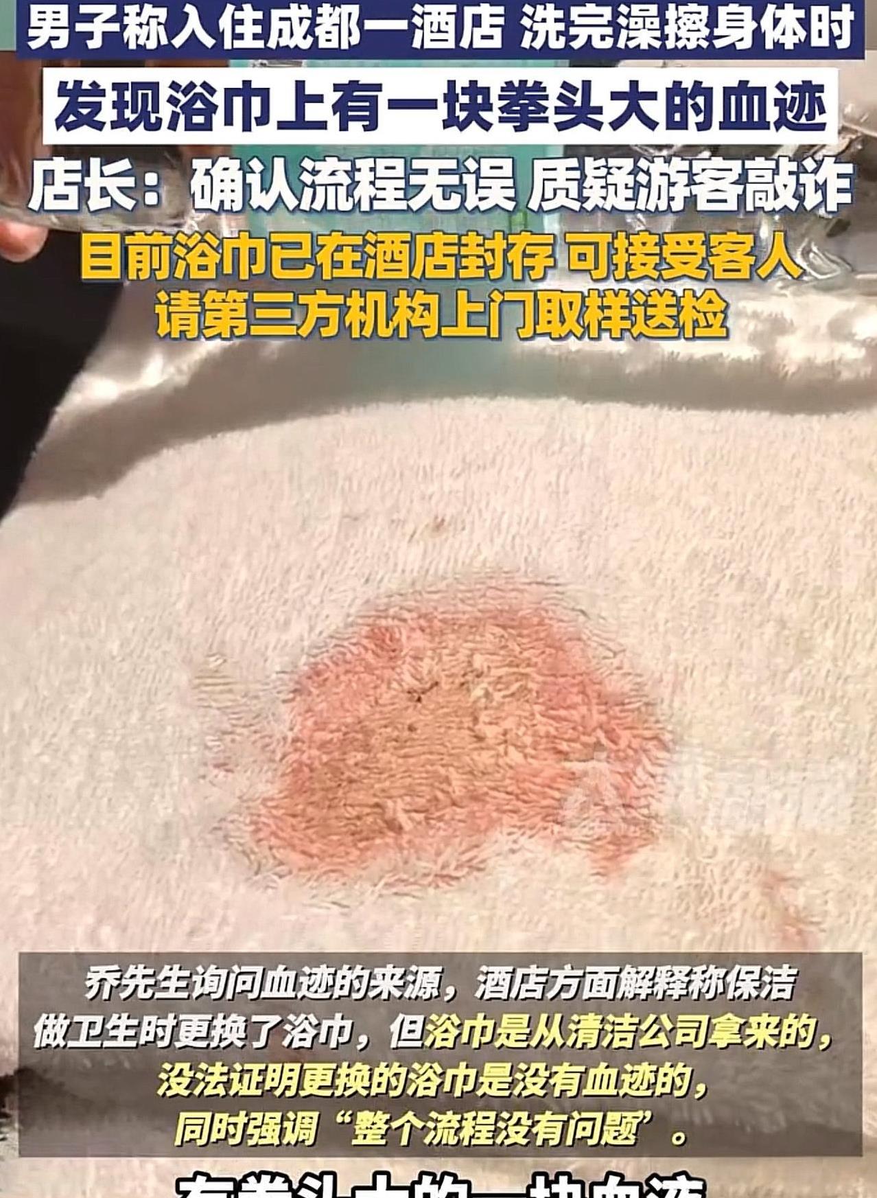 四川成都,男子入住某酒店,洗完澡后,用浴巾擦拭身体,突然发现浴巾上有拳头大的血迹