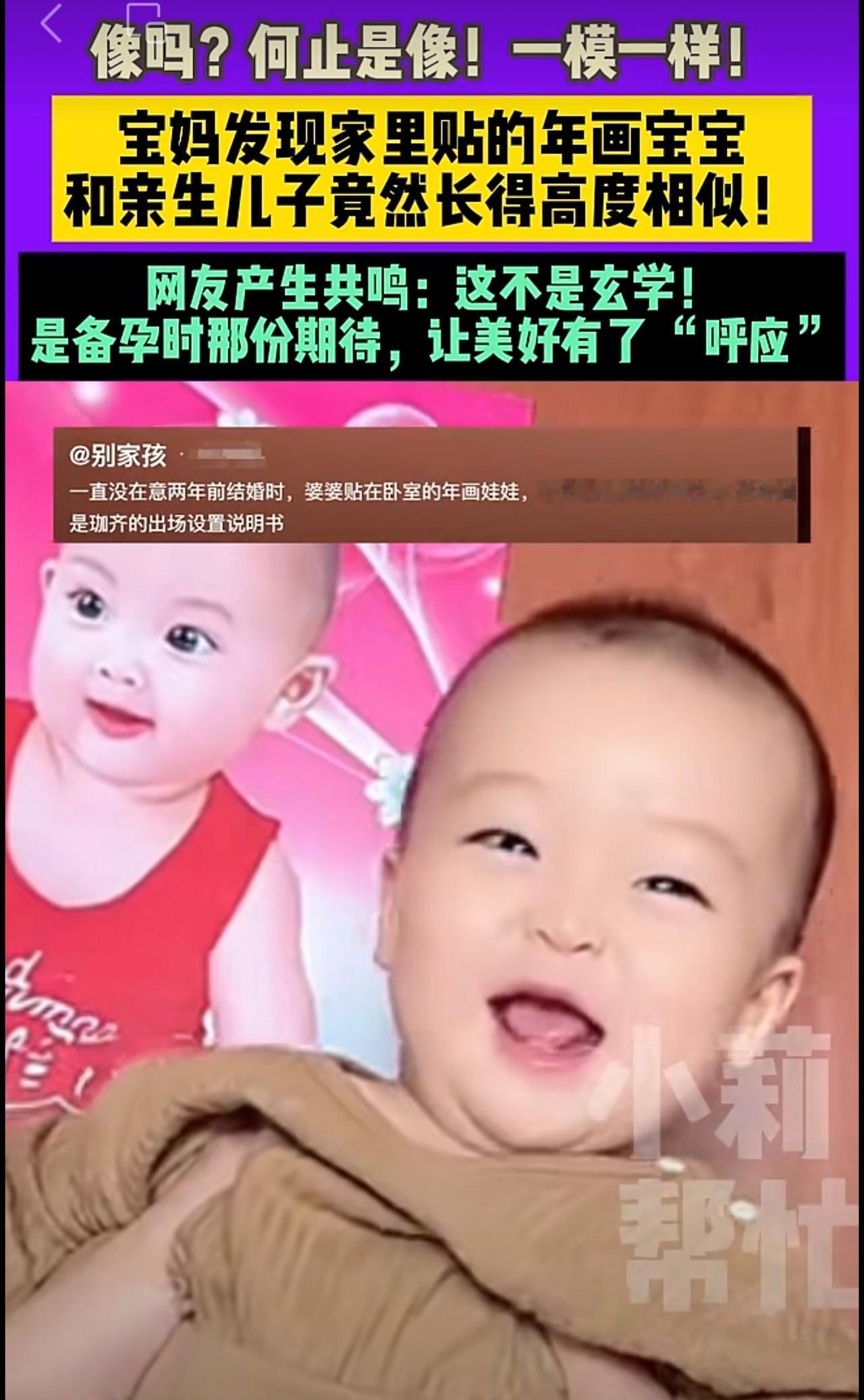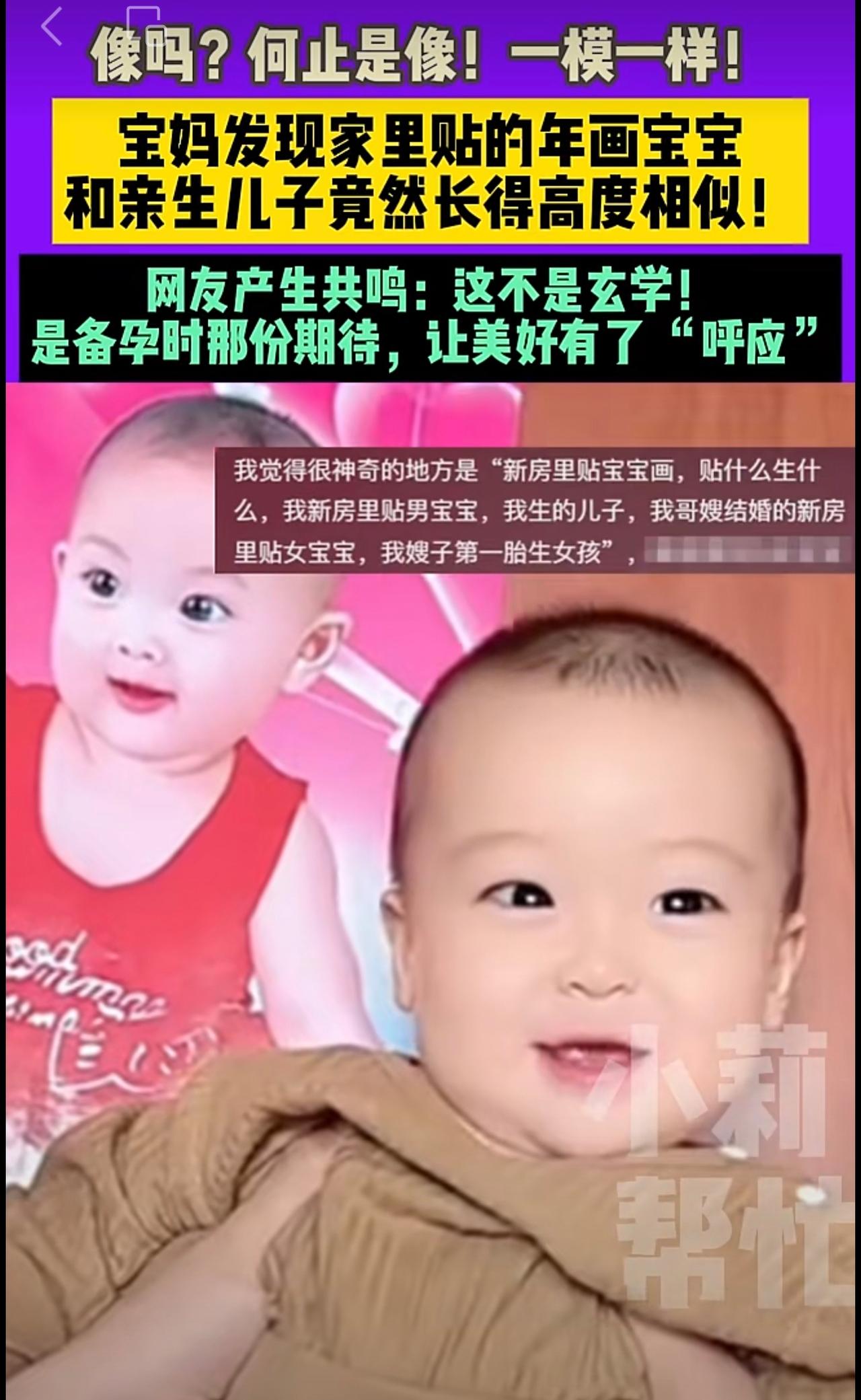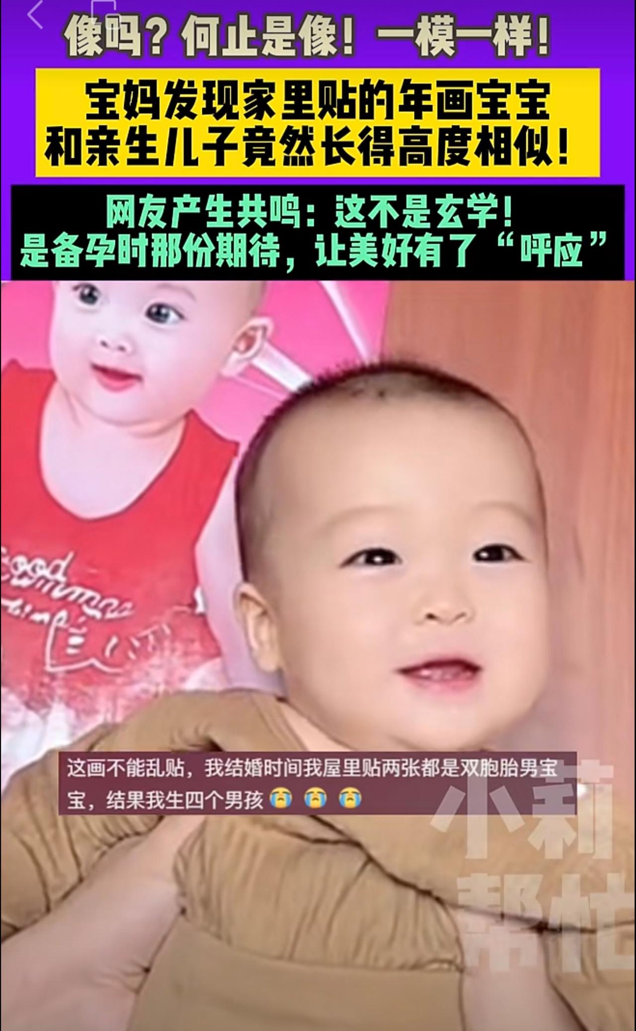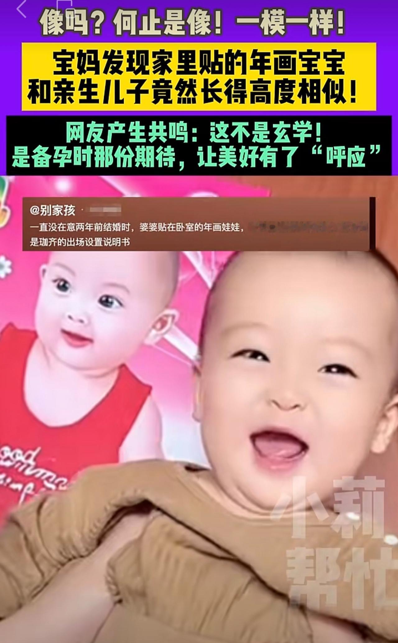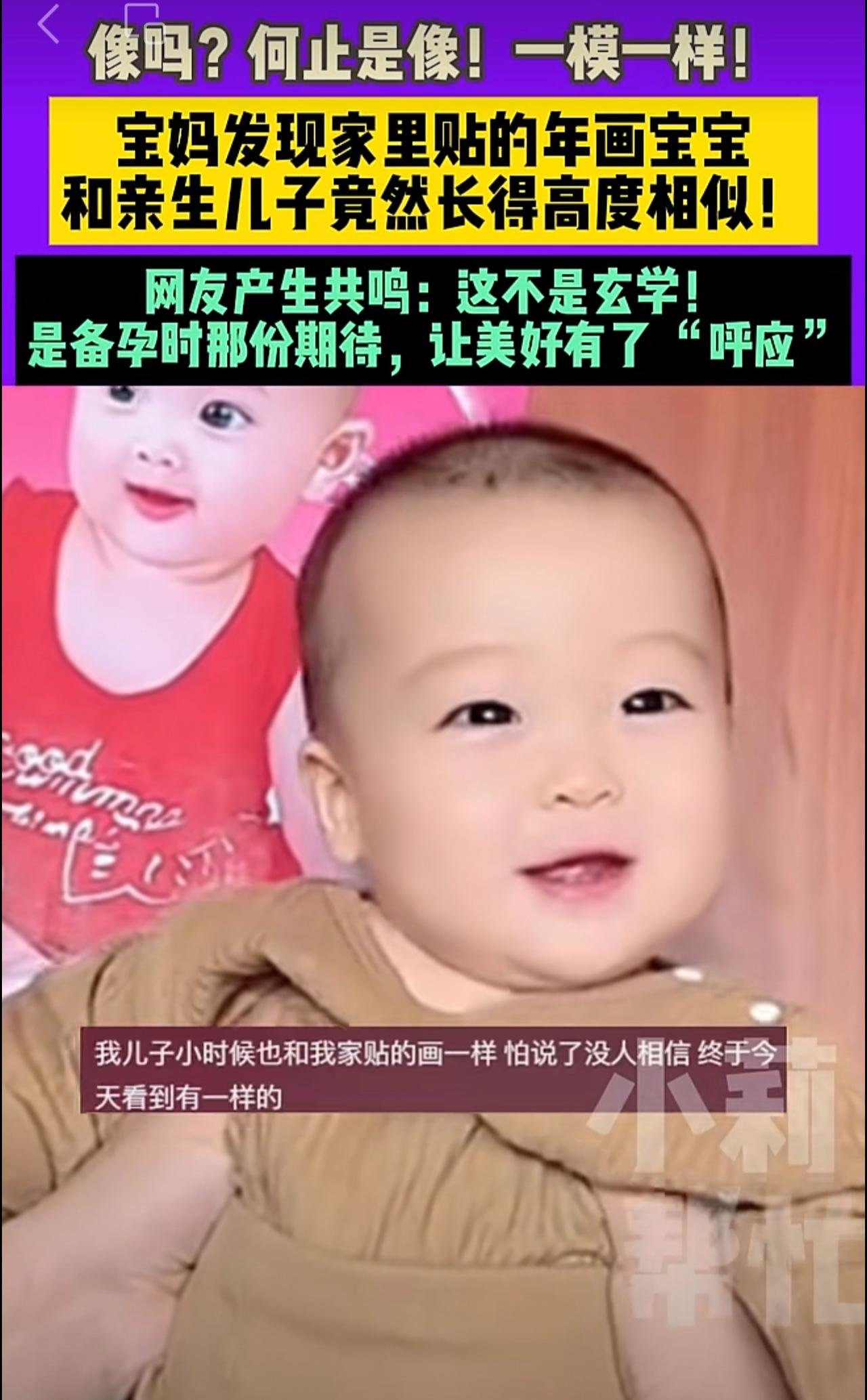 10月8日(发布)山东·济南 像吗?何止是像!一模一样!宝妈发现家里贴的年画宝宝和亲生儿子竟然长得高度相似! 网友产生共鸣:这不是玄学!是备孕时那份期待,让美好有了 “呼应”。