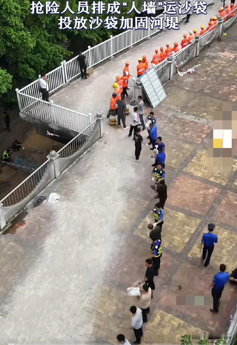 航拍视角南宁抢险,消防人员和志愿者拍成“人墙”运沙袋,往破口扔沙袋加固河堤 现在