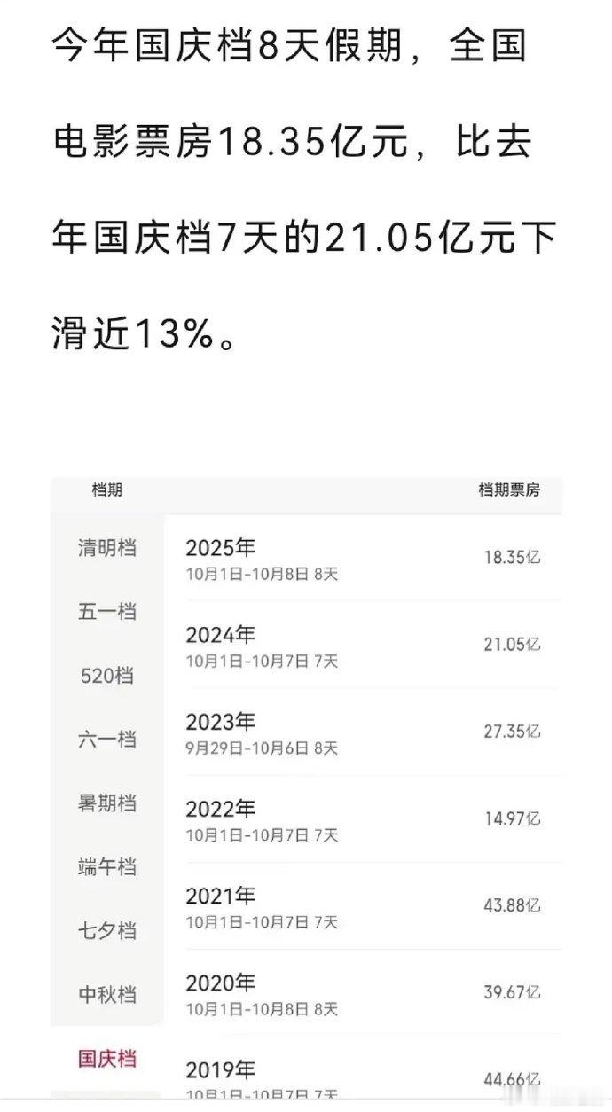 狐厂总结今年的国庆档,比去年下滑13%,退回到十年前的水平 ,这是什么原因?
