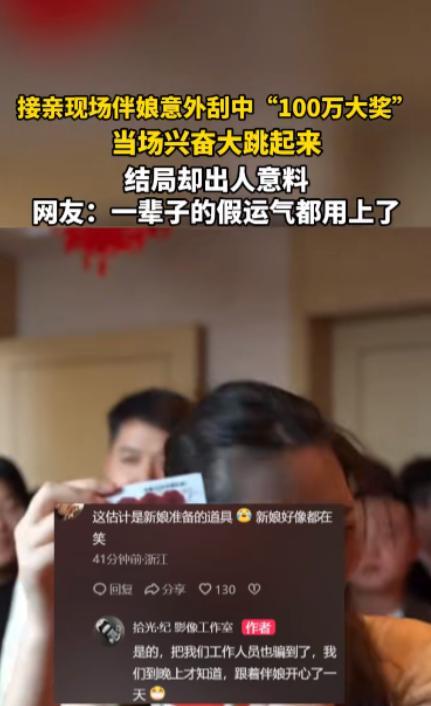“电视剧都不敢这么演!”近日,一位伴娘在接亲现场玩刮刮乐游戏时,竟然意外刮出了一个“100万元” 的一等奖大奖,伴娘为此激动不已,谁知新娘一句话却让伴娘当场傻眼!网友:这就是人生的大起大落啊。 如今越来越多的婚礼现场喜欢加入一些趣味环节,比如刮刮乐彩票,用来调节气氛、娱乐宾客,大家或许都见过或听说过类似的情况,但万万没想到,这个“中奖”的意外竟成了婚礼中的一场“心灵大冒险”。 这天新郎新娘的婚礼现场,气氛欢乐而热烈,为了让婚礼更添趣味感,他们特地准备了几张刮刮乐的彩票,送给了伴郎伴娘。 谁能想到,伴娘竟然在刮的一瞬间,刮出了“100万元”的大奖!彩票的中奖金额赫然写在上面,连旁边的宾客也纷纷围过来,一起祝贺,场面一度非常热烈,大家都被她的好运气惊呆了。 伴娘兴奋得几乎要飞起来,手舞足蹈地庆祝,好像这一百万已经是她口袋里的钱,瞬间觉得自己的生活可能从此发生翻天覆地的变化,连新郎新娘也为她高兴,大家一片欢腾,简直就是一个完美的庆祝时刻。 然而接下来的一句话,却让伴娘当场傻眼,彻底从天堂掉入了深深的“坑”中,新娘淡定地告诉她:“这个彩票不能兑现金,它只是道具,”原来,彩票并不是真的刮刮乐,而是新娘在网上买的假的道具彩票! 这瞬间像一盆冷水浇在了伴娘的头上,她的心情从云端直接摔了下来,那一刻她完全没法接受,原本以为会迎来改变命运的机会,结果却不过是一场精心安排的“空欢喜”。 现场气氛顿时发生了戏剧性转变,伴娘的笑容戛然而止,转瞬间,她的脸上写满了不可置信和失落。 宾客们见状,也意识到发生了什么事情,气氛从热烈转为尴尬,一时之间连摄影师也愣住了,原本他还在忙着记录“中奖”的精彩瞬间,结果成了他意料之外的一场笑话。 不得不说,这场婚礼的“刮刮乐”环节,虽然让现场所有人都惊呆了,但伴娘的失落也让人心生同情。 她本是充满期待和幸运的人,结果却被这份假彩票狠狠“打脸”,大家心里清楚,这其实不过是为了婚礼更有趣而设计的一个环节,但对伴娘来说,这种戏剧化的反转无疑让她尝到了人生的“大起大落”,这种情绪的波动,恐怕连电视剧编剧都不会想象得出。 实际上,这种情节的设置并不罕见,许多婚礼都会选择一些特殊的道具来调动气氛,尤其是在中国的婚礼上,“刮刮乐”已经成了一种常见的小互动。 然而把这种“道具彩票”作为一种喜庆的气氛制造方式,是否考虑过参与者的感受呢?毕竟谁能预料到刮出大奖的人会如此真心地庆祝,最后却被告知这只是个假奖项?这种心理落差也许会让人在某一时刻感到错愕甚至无奈。 人们总说,彩票是“靠运气”,但是,这种意外中奖的喜悦和随之而来的落空,往往更像是生活中的一种“现实剧”,每个人都可能在某个时刻经历这种大起大落,站在高处时满怀憧憬,而失望却常常悄然来临。 对伴娘来说,这无疑是一场巨大的心理过山车,她本以为生活的困境即将得到解决,却在最快乐的时刻遇到了冷酷的现实,这种情绪上的过山车,恐怕是婚礼上最意外的戏剧性转折。 但或许,正是这种突如其来的失落,才让人更加明白,婚礼不只是一个庆祝的时刻,它也可能是人生中一个难忘的教训。 这一切也许能让人意识到,生活中的确充满了不确定性,幸福和失落总是交替而来,而真正的“大奖”,也许不在刮刮乐的纸面上,而是在自己内心的积淀和成长中。 这场婚礼的插曲,让人不禁想,虽然“空欢喜一场”有些遗憾,但人生就是如此,充满了不可预见的意外与波动。 从这个角度看,刮刮乐的事件或许让我们更清楚地看到了生活的无常和戏剧性。 对于这件事情,大家有什么看法? 信息来源:《伴娘意外刮中“100万大奖”,当场兴奋大跳,结果竟是道具,网友:一辈子的假运气都用上了》观象视频