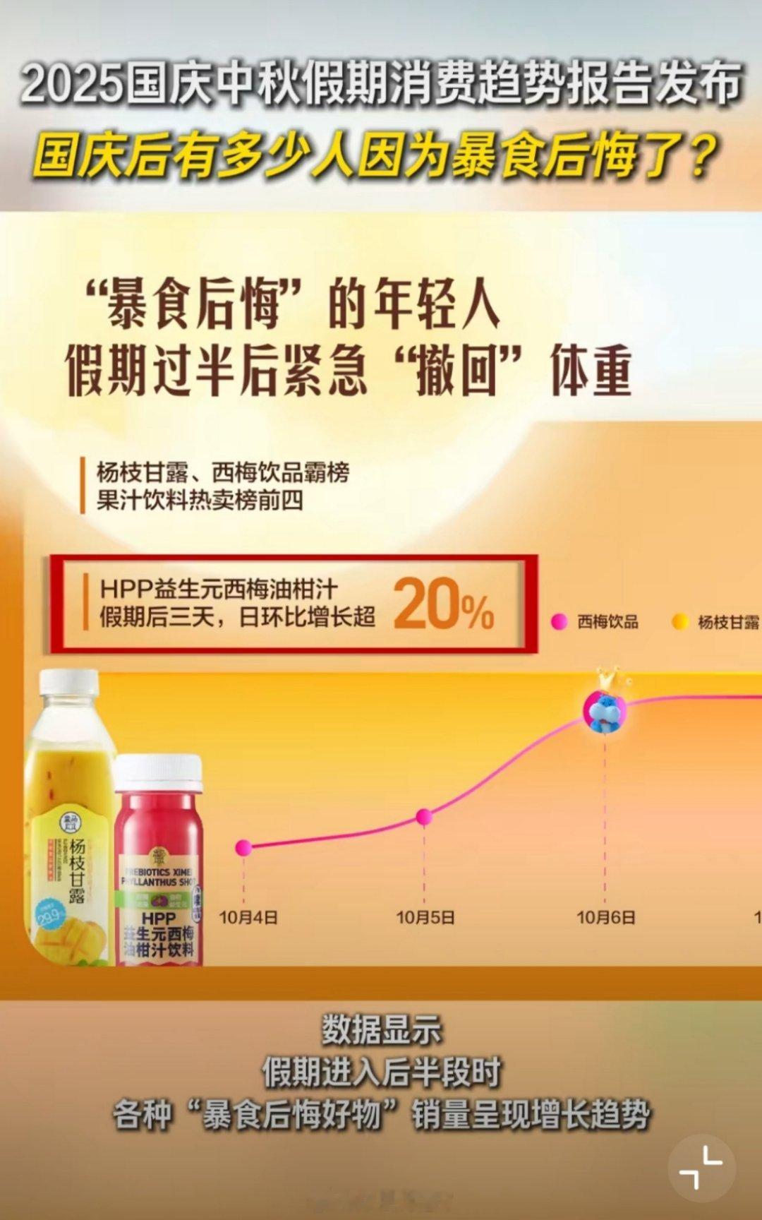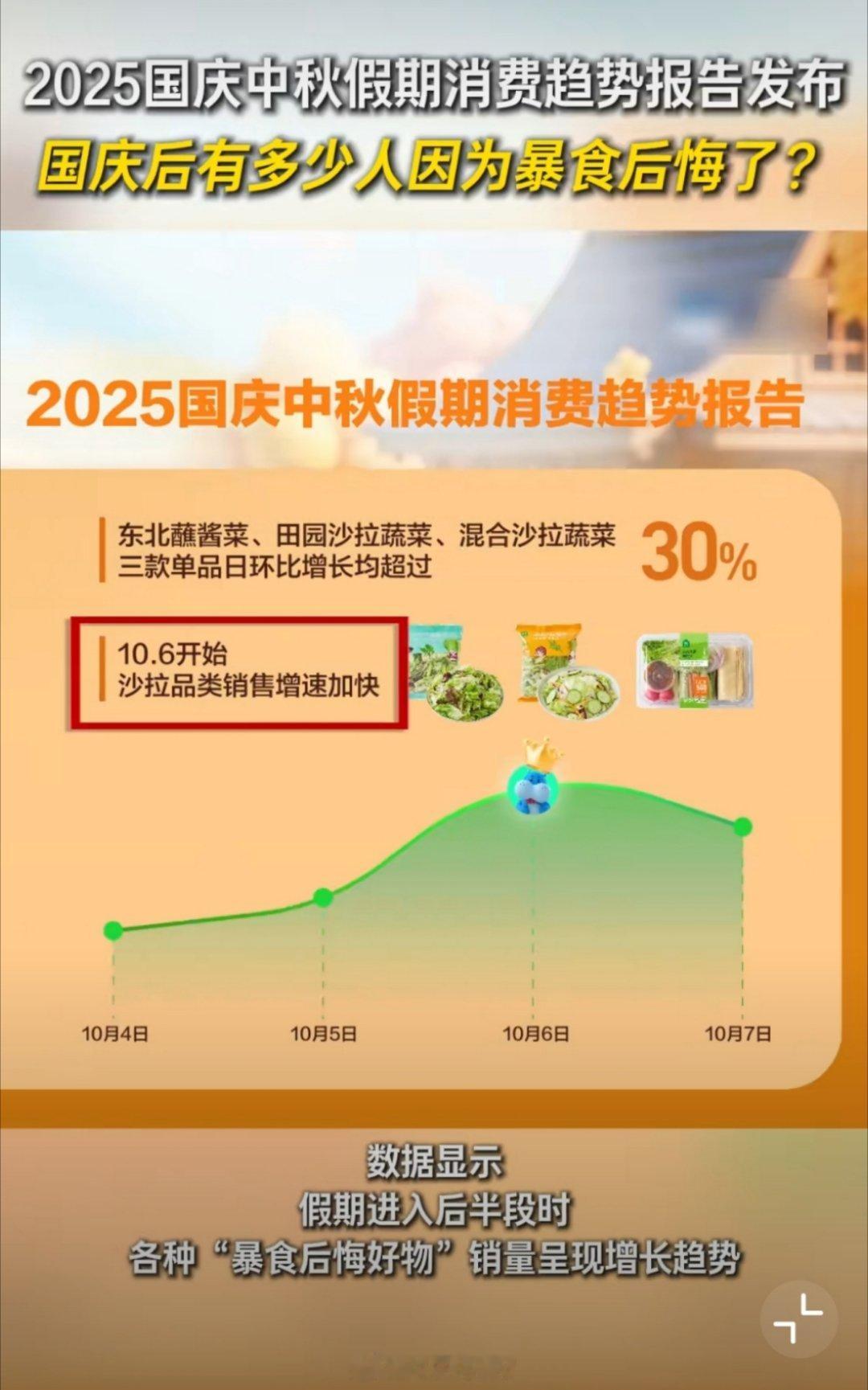 我也看到有商超平台发布《2025国庆中秋假期消费趋势报告》,数据显示,假期进入后半段时,有很多朋友和我一样,去商超购买各种“暴食后悔好物”,其中低热量轻食、清爽解腻饮品的销量涨势明显。