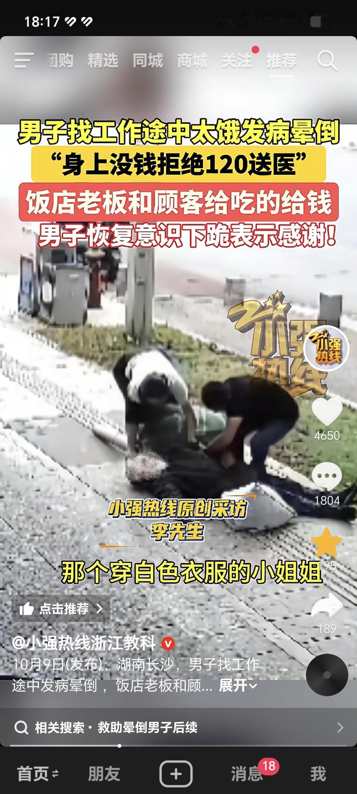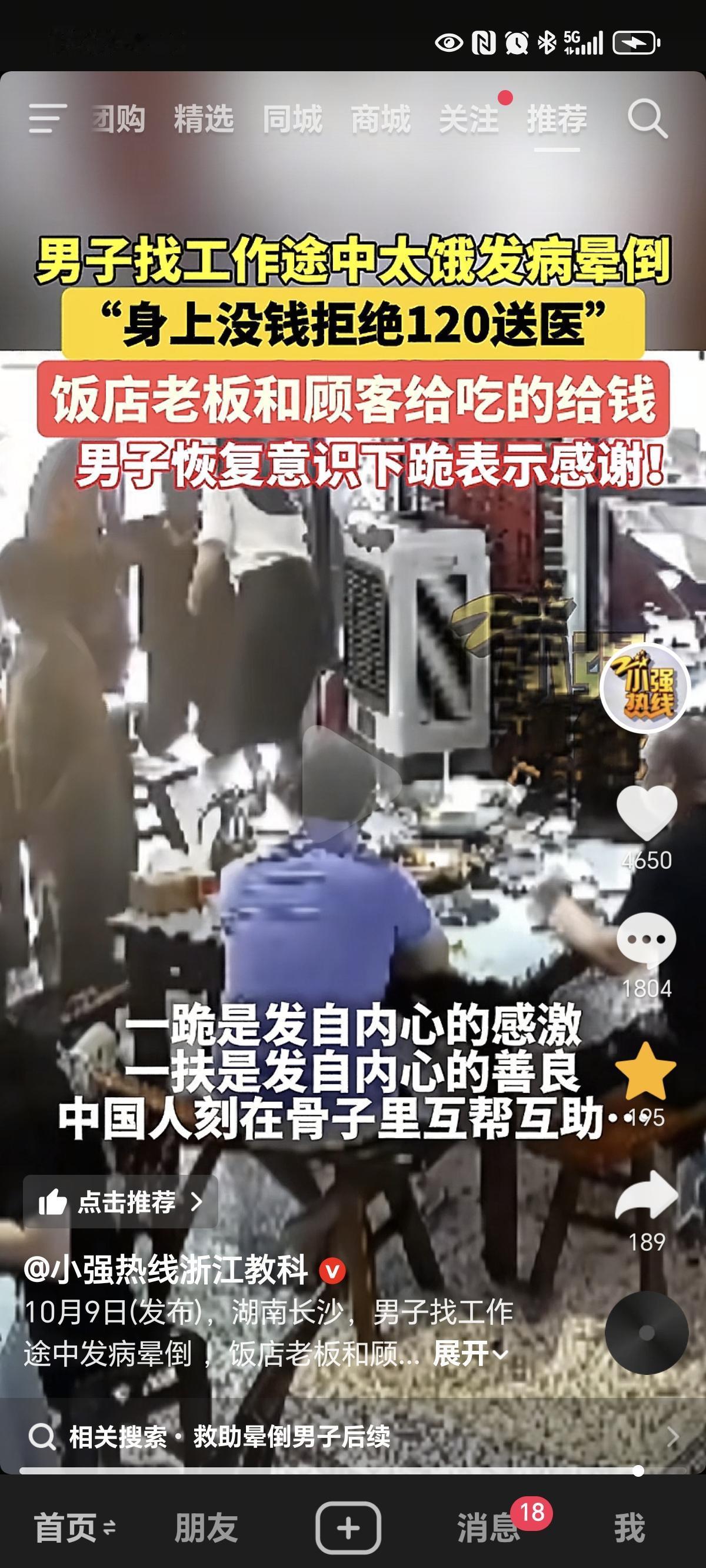 10月9号,一男子从湖南益阳到长沙找工作,由于没合适的机会,所以暂时没有落脚的地方,在行走途中,由于饥饿诱发疾病晕倒了,幸好得到了旁边饭店老板和顾客的救助才苏醒过来,这要是在凌晨,夜深人静,很可能命就没了,想想都心酸。 经过了解,才知道,一个人没成过家,没有孩子,没有亲人,手里钱不多,连个行李箱都不舍得买,用扁担来挑物品,真是负重前行呀。其实要真是饿了,随便找一个路边摊要一点食物,哪怕几个馒头,90%的老板都会给,可能脸皮薄,好面子,才自己苦苦支撑。 可男子懂感恩,等吃完了食物,吃完了口袋里的药,人体力恢复之后,知道自己拿不出什么东西进行回报,直接到饭店大厅,面对众人都在吃饭,不顾任何尊严,选择了下跪的方式,俗话说,男儿膝下有黄金,这很珍贵。 啥事都有好都有坏,一个人吃饱还全家不饿呢,希望男子放下面子,哪怕找一个保安,每个月2000多块钱,最起码能够吃饱饭呀。