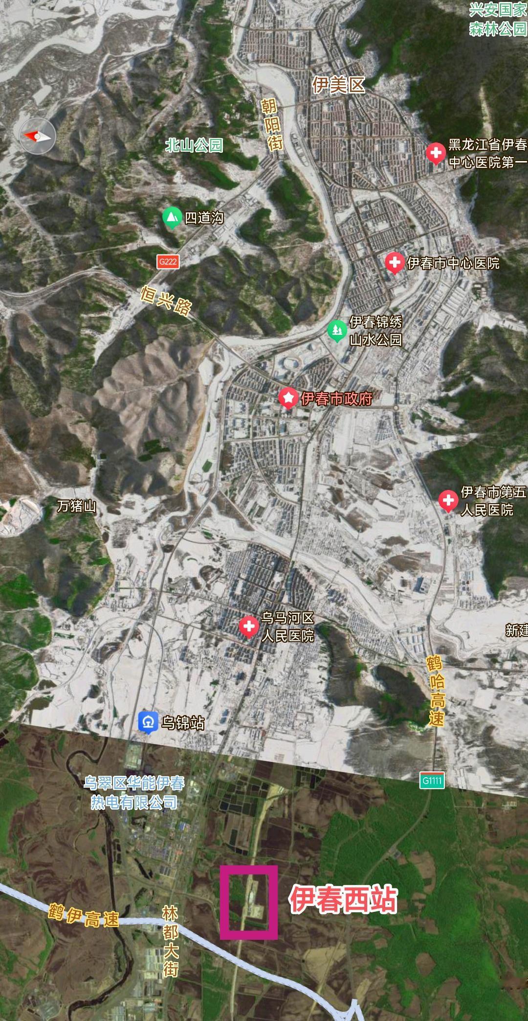 虽然在明年绥化与伊春将步入高铁时代,但是高铁站的位置还是存在差距。放眼望去绥化南站的位置靠近市内,百姓出门还是很方便。 相比之下伊春西站的位置就有点偏僻,如果来到实地现场会发现高铁站方圆2公里看不到任何的住宅小区,这对于收缩型城市来说交通出行还是有些不方便。 见此情景不禁感慨哈伊高铁开通后伊春西站周边应该多开通几条公交线路,只有这样外地游客到伊春市内各大景点才会方便快捷。